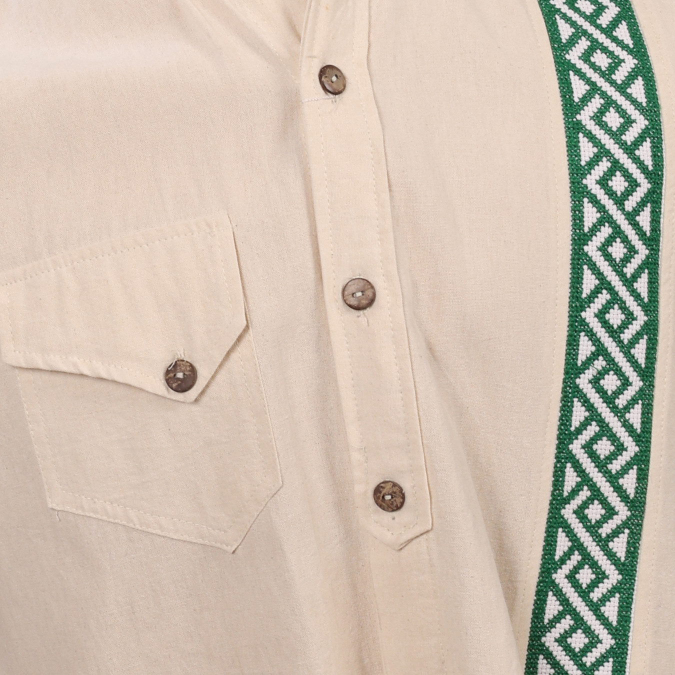 El artesano Guillermo Patiño nos presenta esta prenda, una camisa de manta confeccionada con bordado a mano. El bordado es un diseño geométrico trenzado, de color verde oscuro.