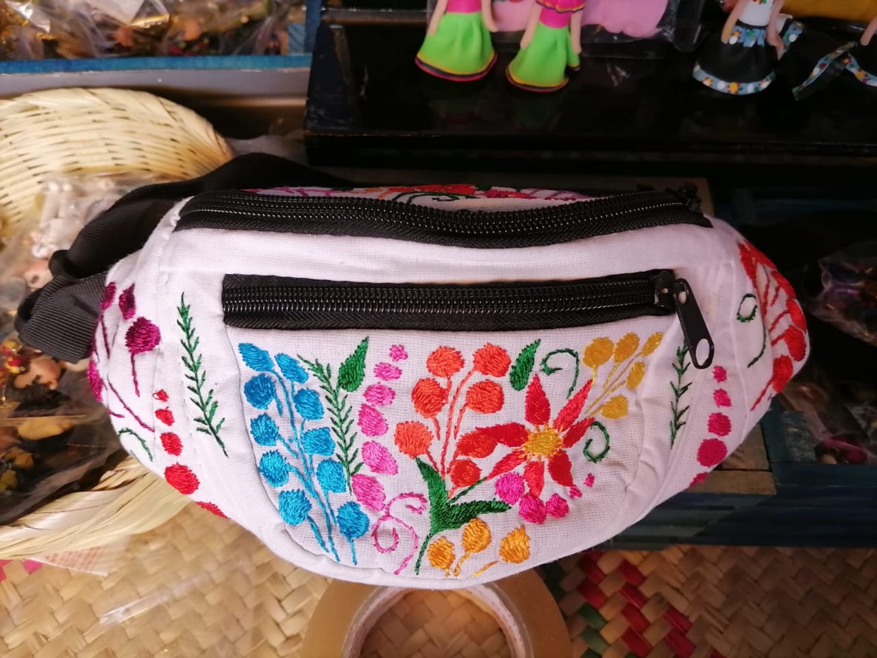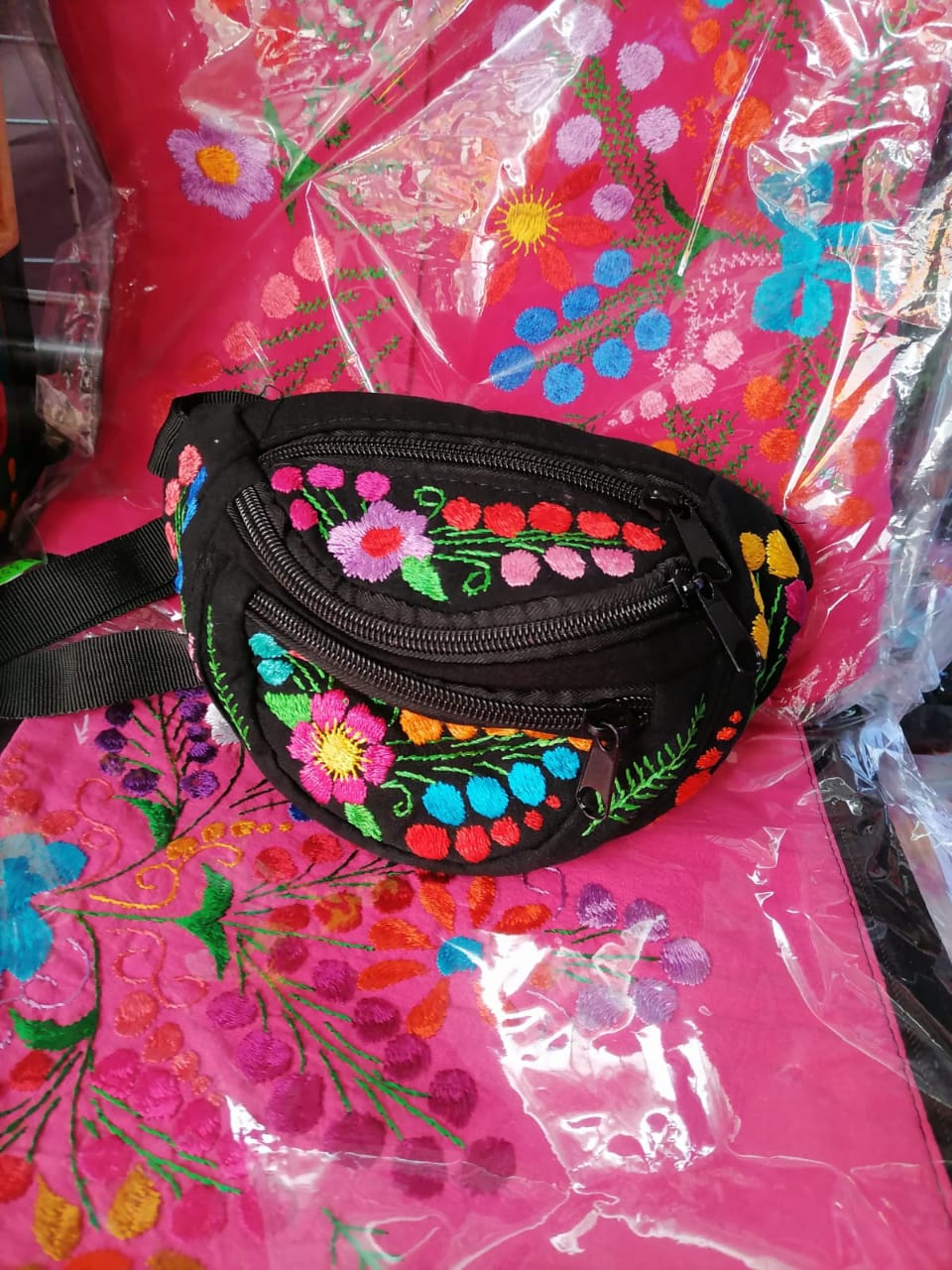 Cangurera bordado a mano con hilo iris rayón en varios tonos de colores. Ideal para mujeres y hombres, bordadas por mujeres de Acatlan municipio de Chilapa de Álvarez, Guerrero.