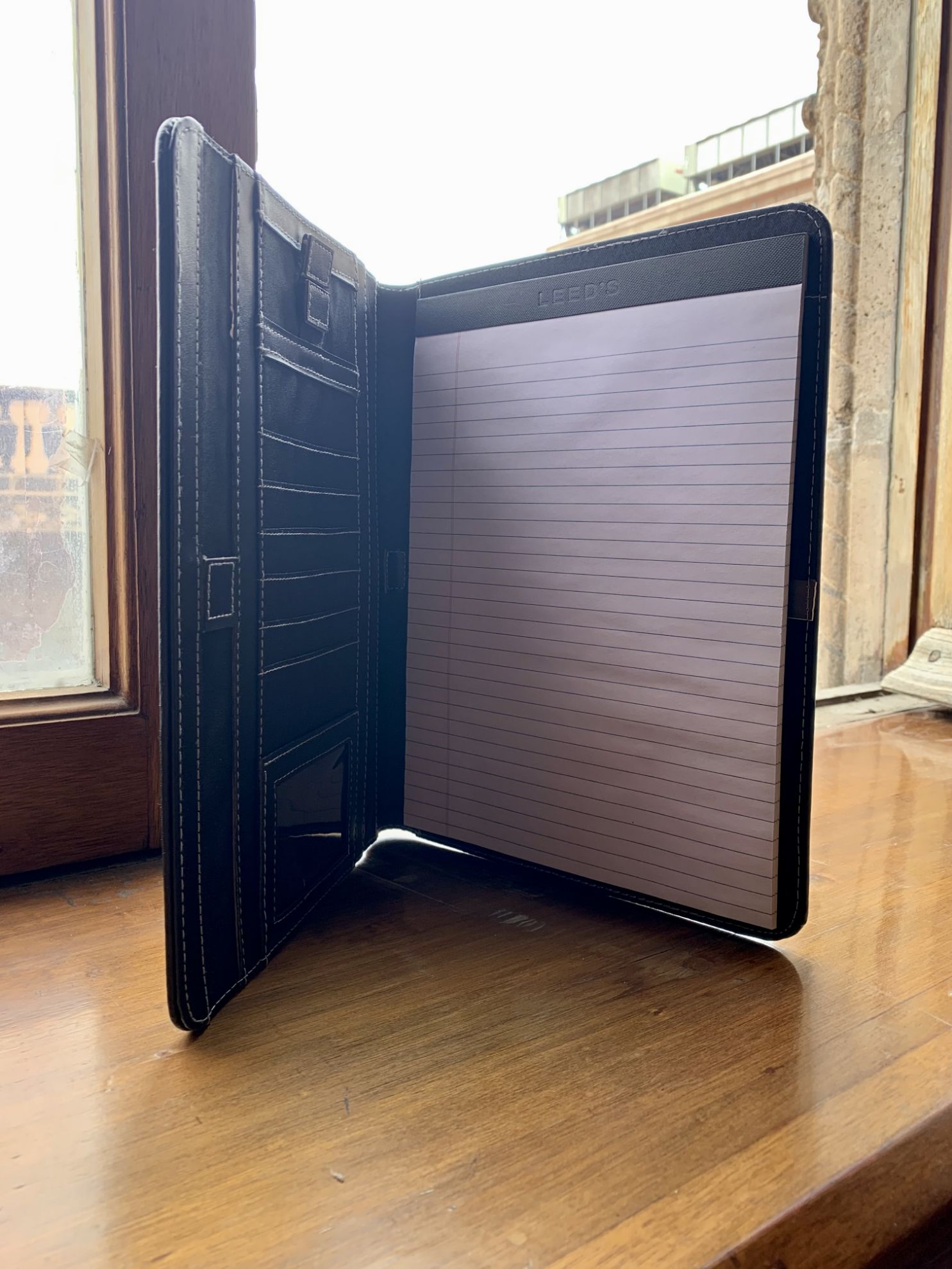 Carpera de Vinipiel color negro con sublimado del Palacio Postal y un block de hojas rayadas.