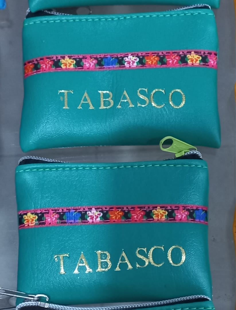 Monedero para dama en poli piel de color turquesa, con medidas de base 10 cm y de alto 5cm ideal para llevar tus monedas. Podemos grabarle iniciales o una frase de maximo 7 letras en dorado o plateado, asi como esta grabado la palabra tabasco