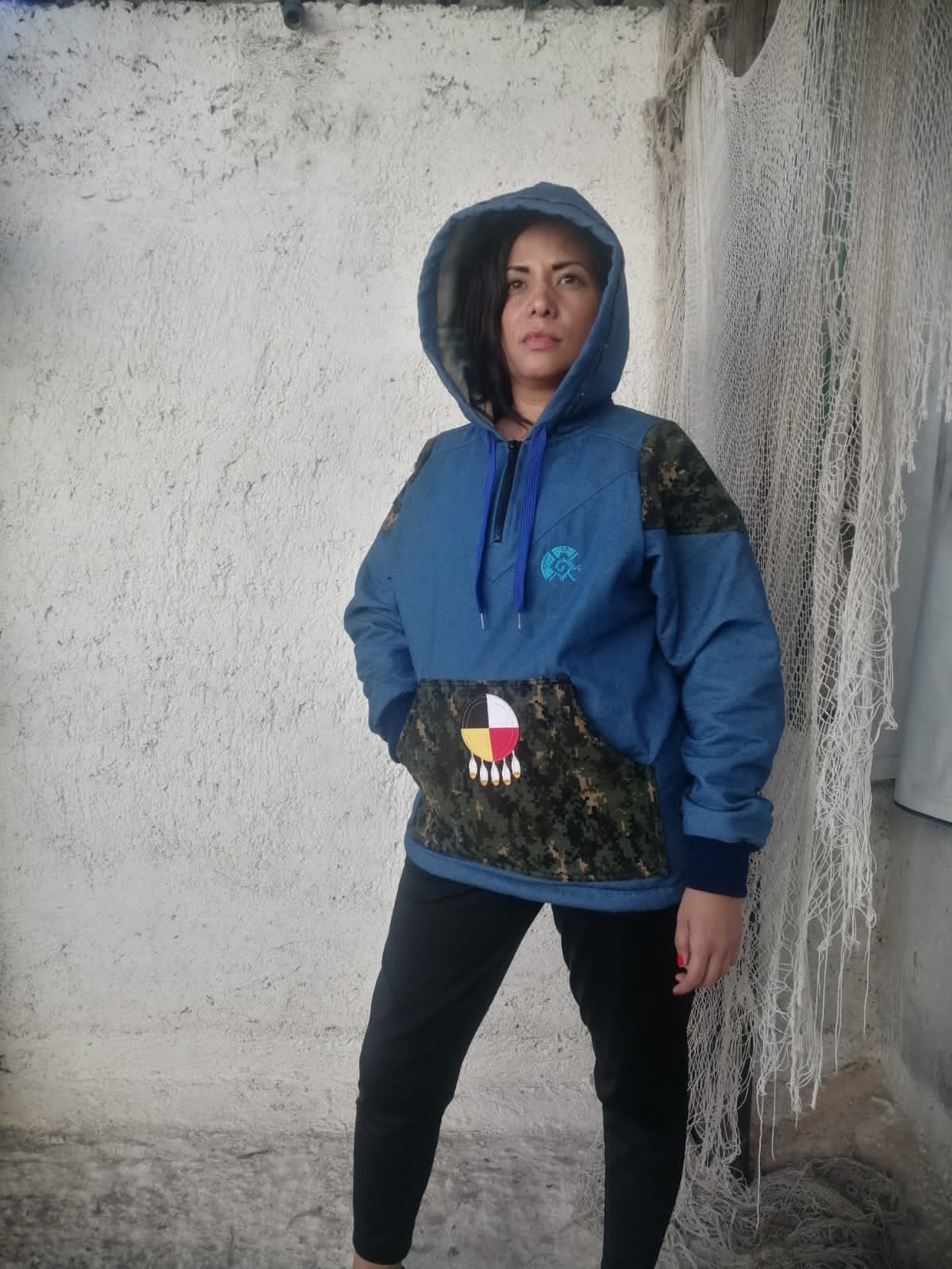 Chamarra de mezclilla azul claro,forrada con borrega,mangas y gorro forradas con polar,gorro con jareta,cardigan elastico en puños,jareta ajustable en cintura,bolsa delantera con detalle guerrillero y bordaddo del "camino rojo",cierre de diente grueso al cuello,aplicacion en mangas con tela guerrillera y bordado de "HECHO en MEXICO",.