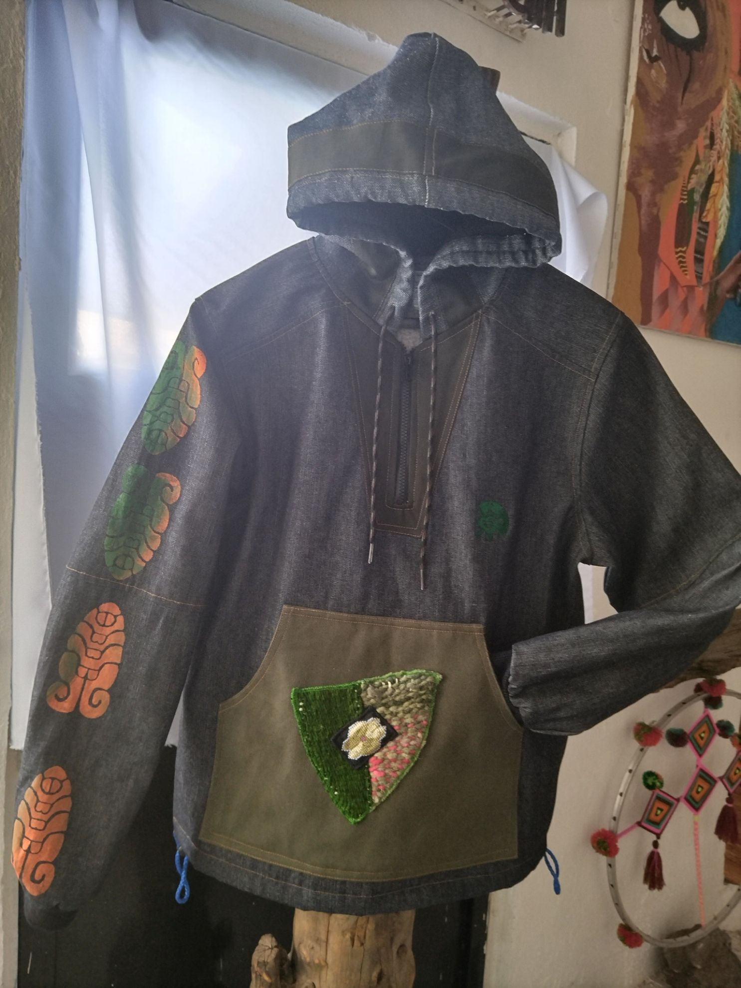 *Bolsa al frente de gabardina verde con detalle en lana-pura y al centro "Hikuri" bordado a mano(Artesanal)