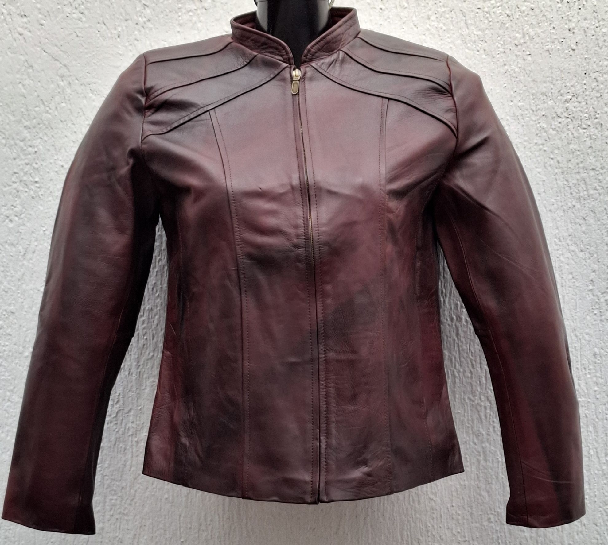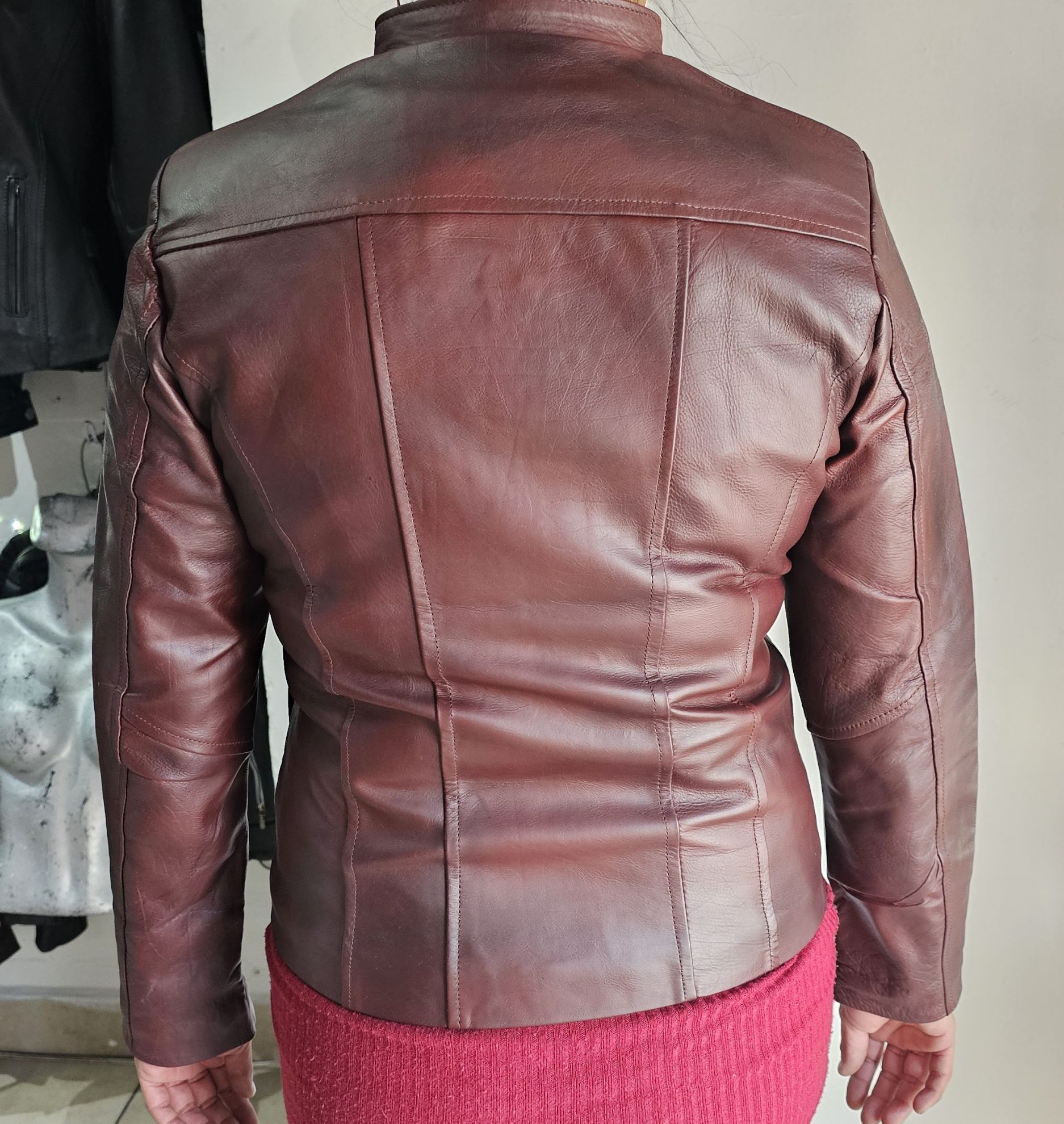 Chamarra en piel de borrego peligüey color vino para mujer. Juvenil y comoda
