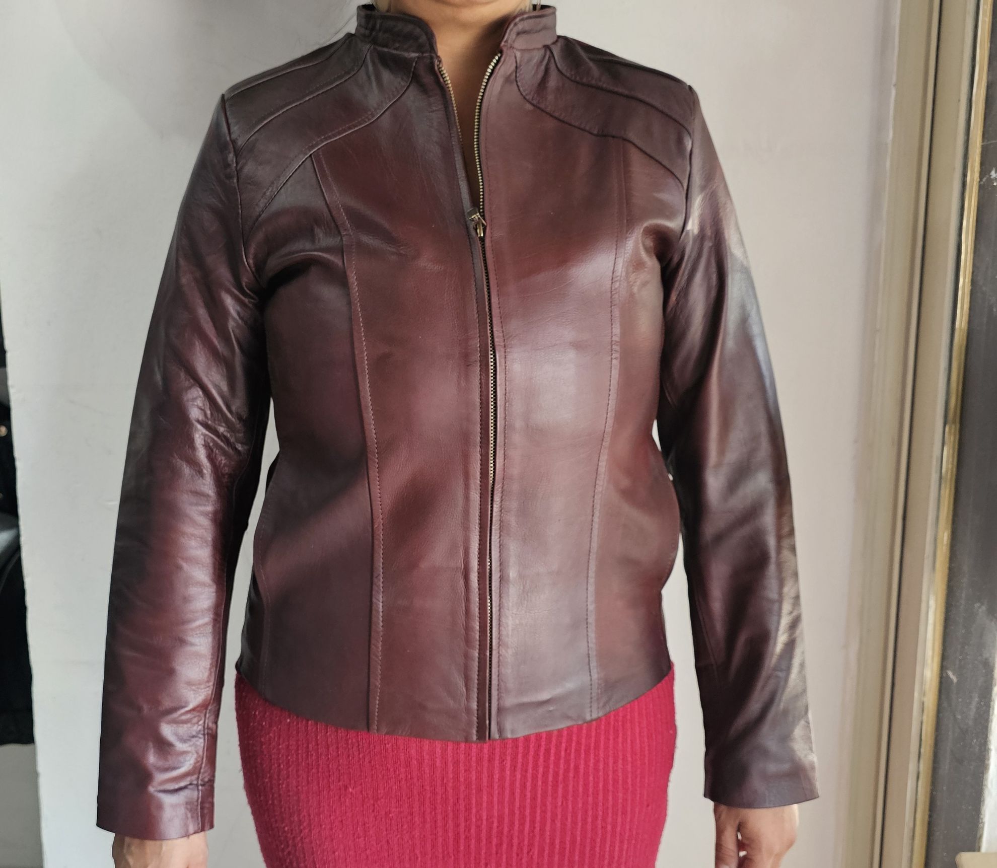 Chamarra en piel de borrego peligüey (Borrego Tabasco) color vino para mujer