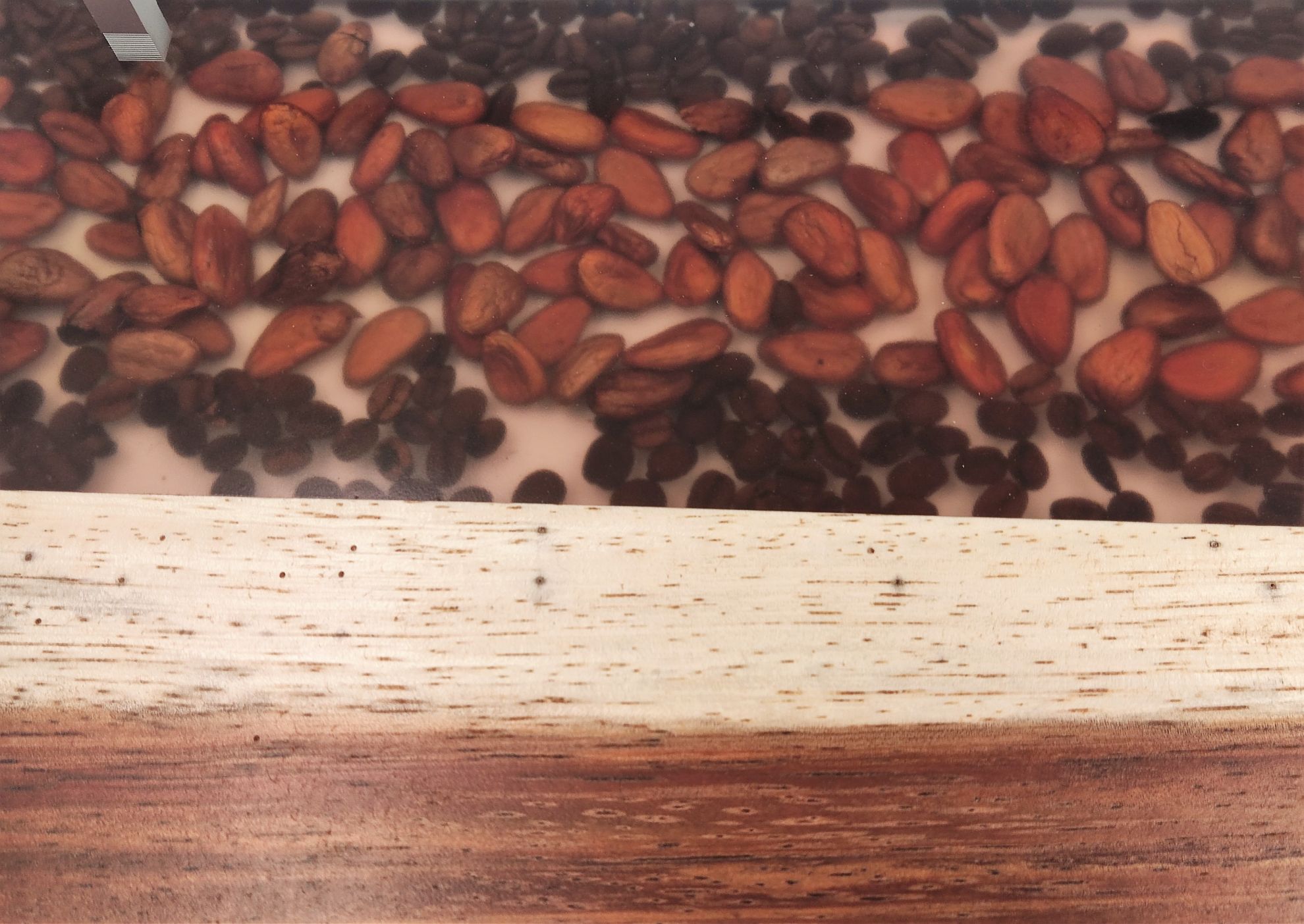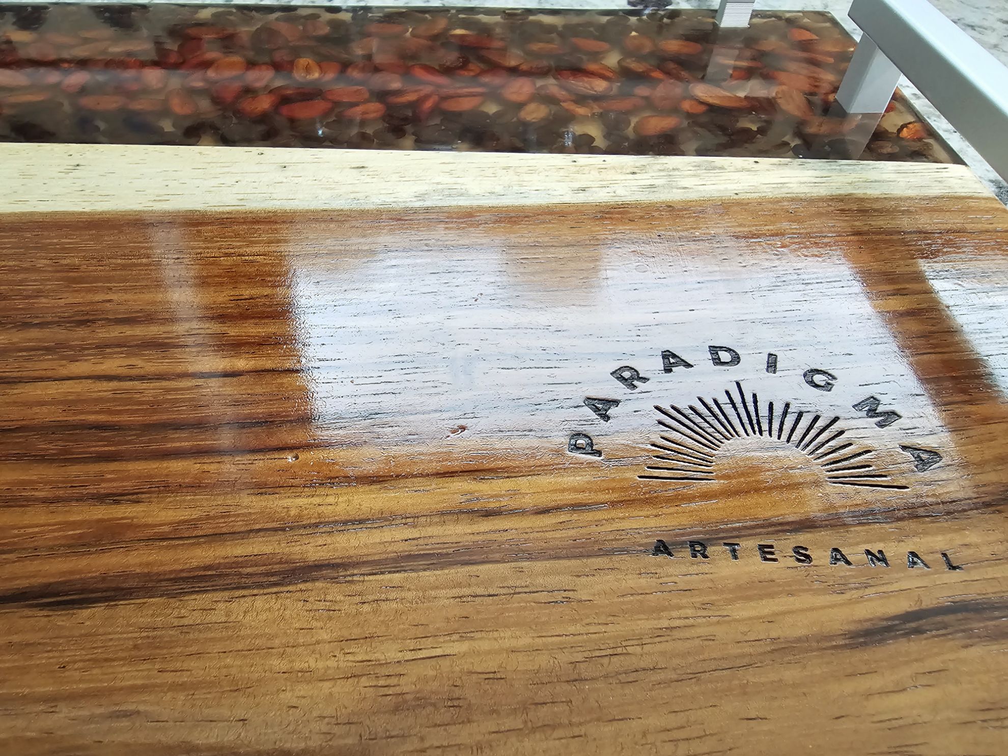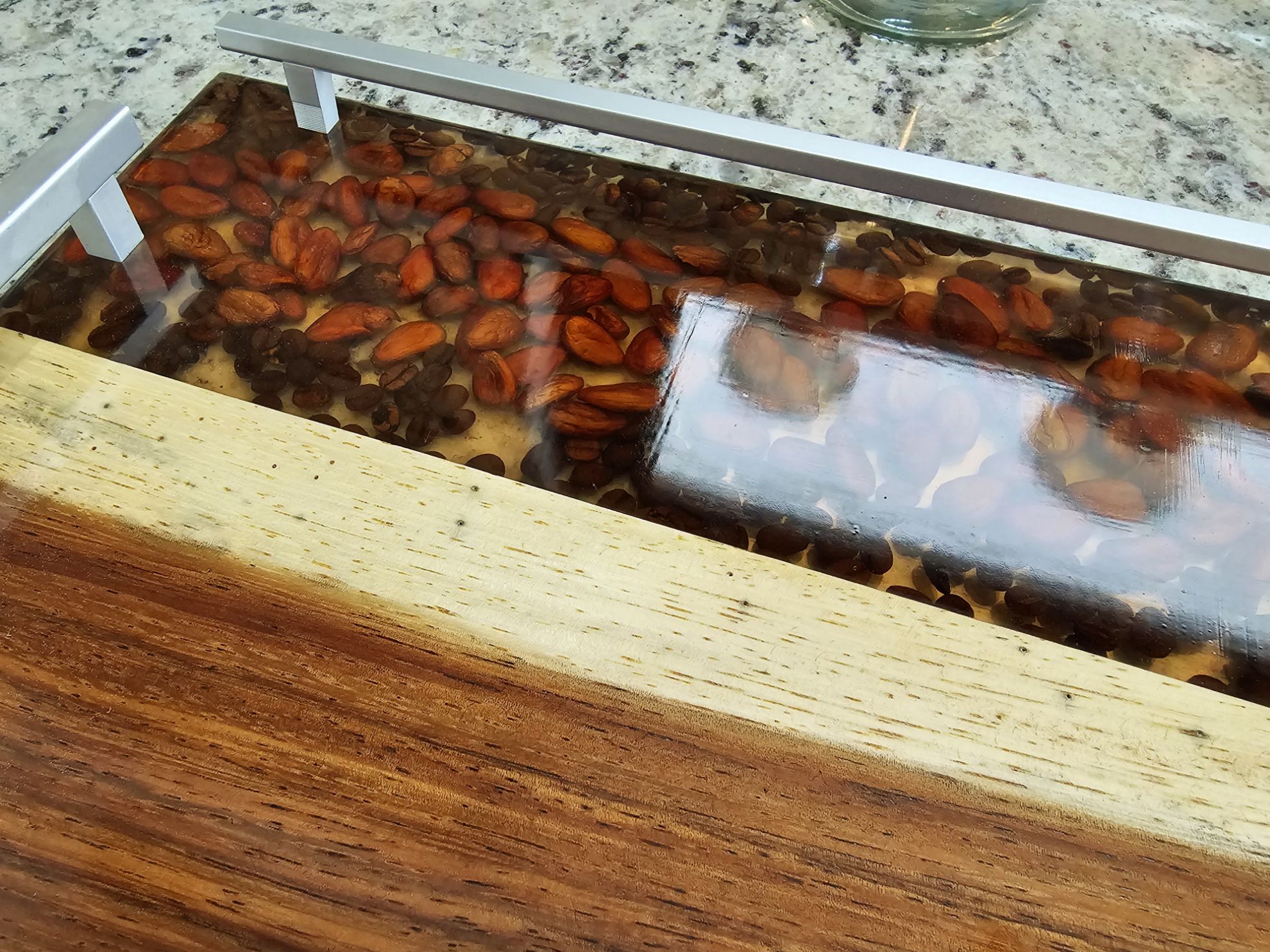 Hermosa Charola para servir Alimentos, elaborada en Madera de Parota y Resina de Alta densidad, en ella se encapsulo grando de cafe y cacao. Cuenta con asas y varandilla de aluminio peinado. Pieza elaborada artisticamente que resaltara en su hogar u oficina.