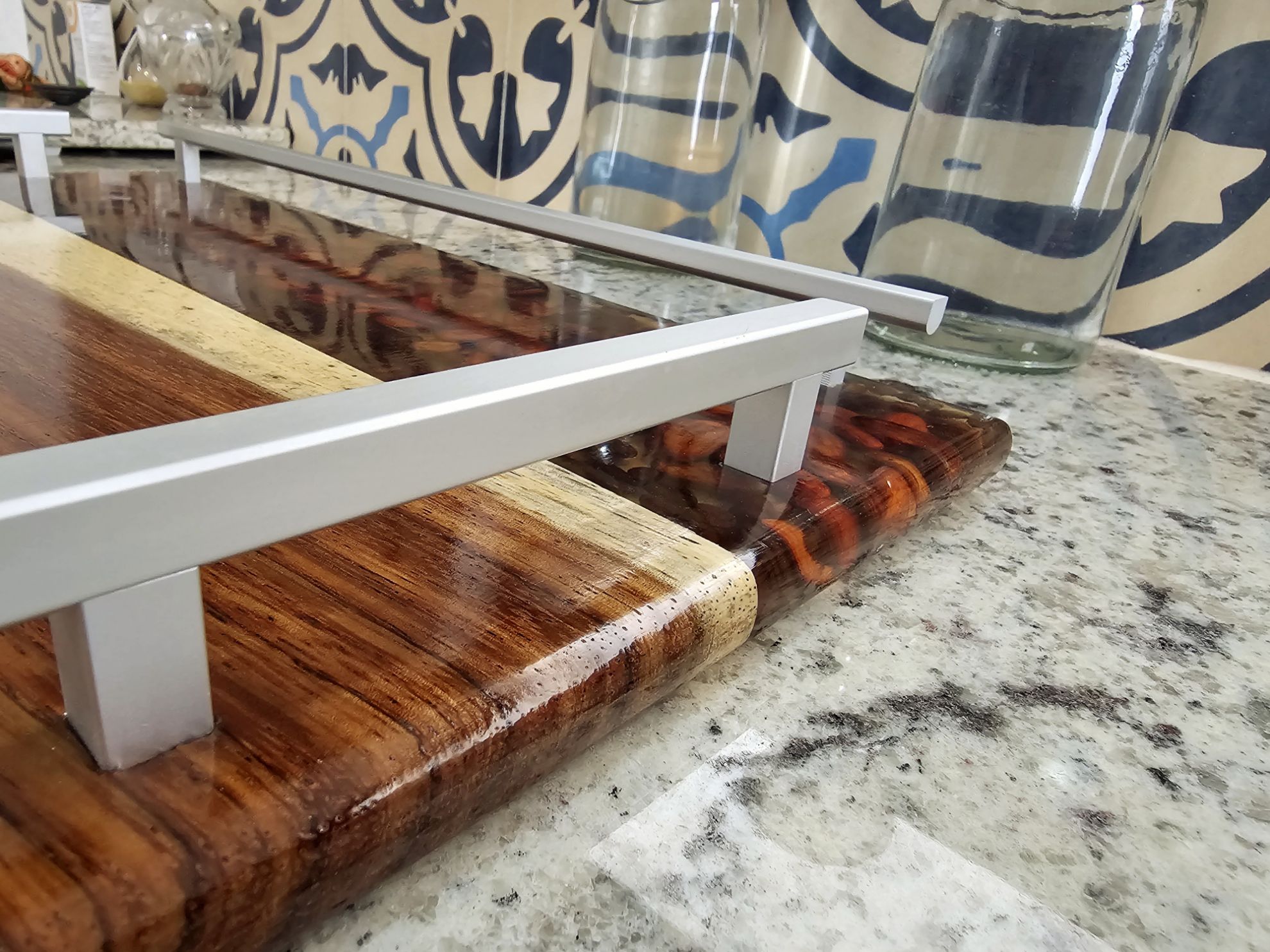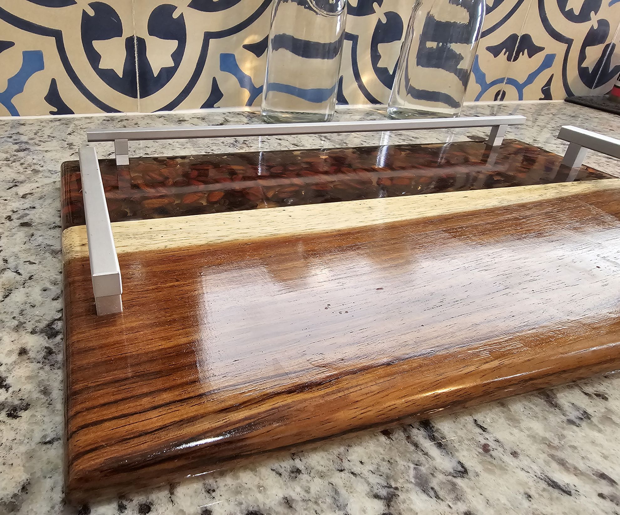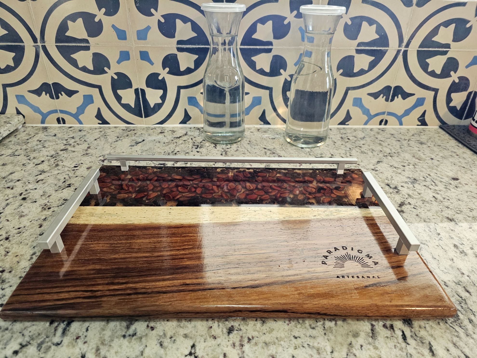 Hermosa Charola para servir Alimentos, elaborada en Madera de Parota y Resina de Alta densidad, en ella se encapsulo grando de cafe y cacao. Cuenta con asas y varandilla de aluminio peinado. Pieza elaborada artisticamente que resaltara en su hogar u oficina.