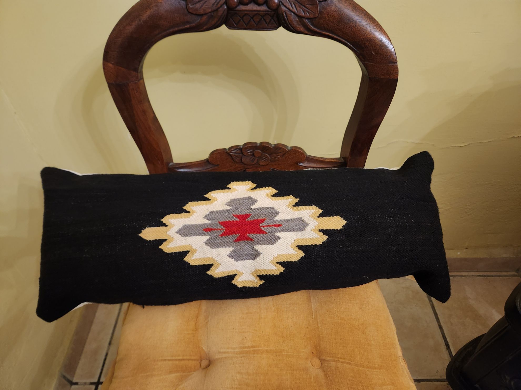 Cojin riñonero elaborado con hilo de lana teñida tejido en en telar de pedal, con cierre para rellenar, ideal para decorar tus espacios.