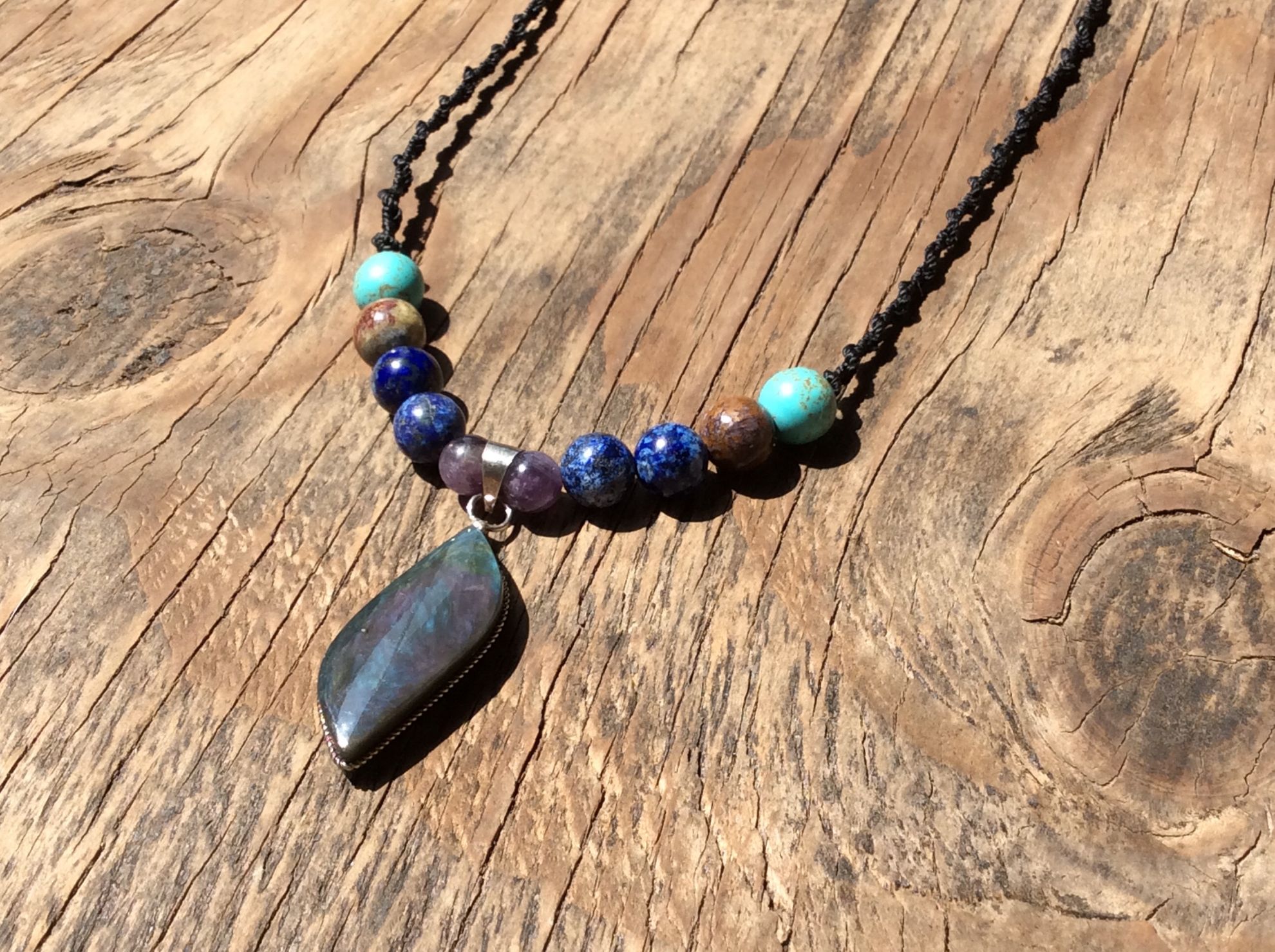 El collar está elaborado a mano con macramé duradero y resistente a los hilos, lo que garantiza un ajuste cómodo y seguro. El collar de 50 cm (20”) permite que el colgante se ajuste perfectamente al pecho, llamando la atención con sus vibrantes colores y texturas.