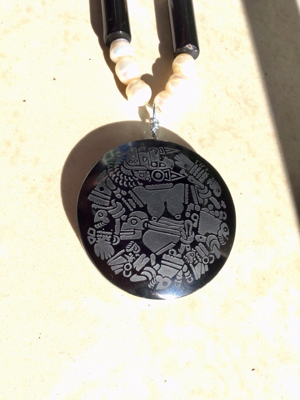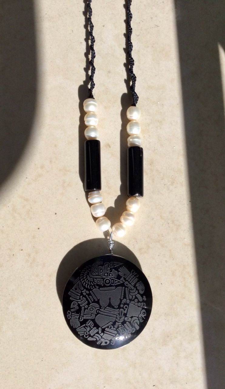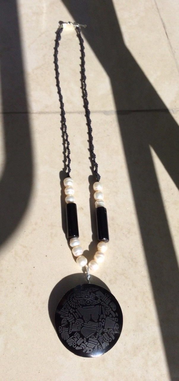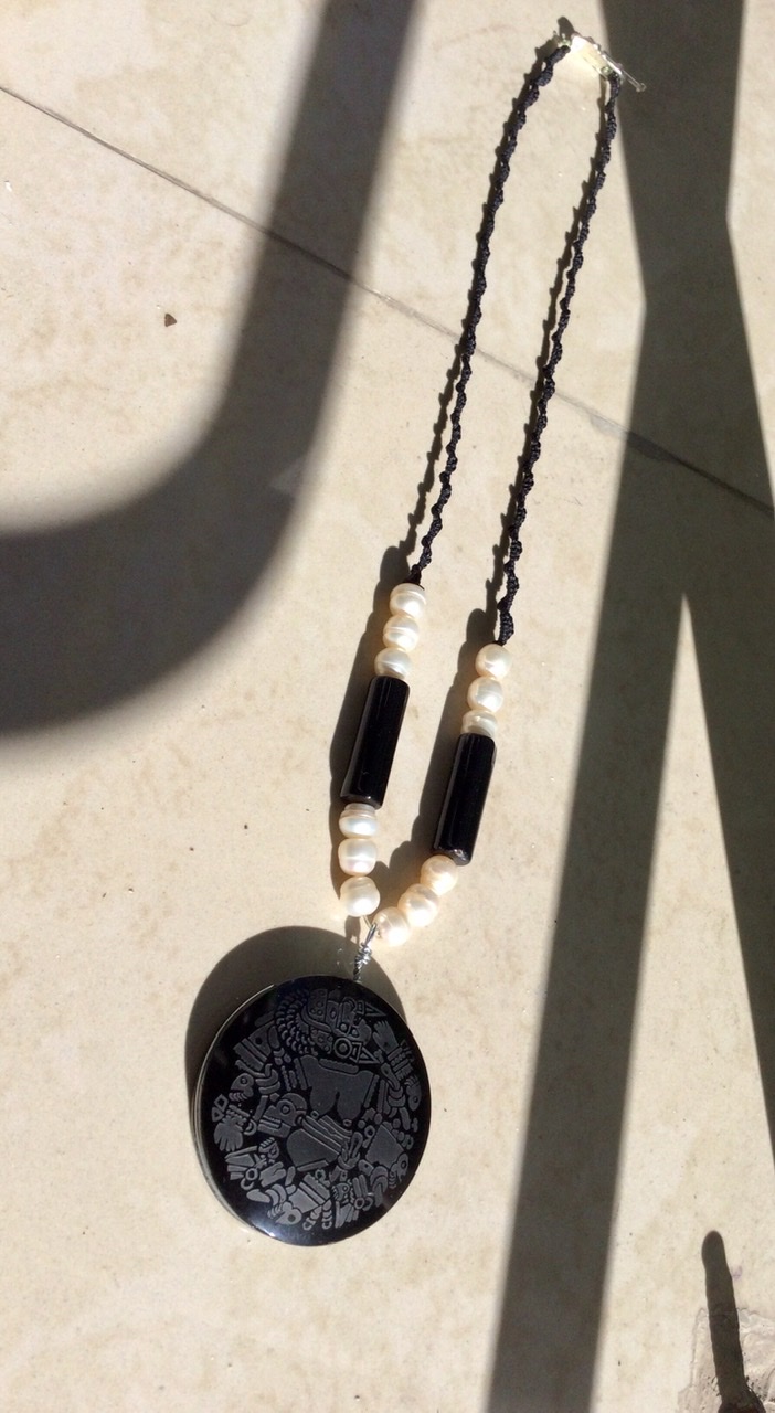 Ese collar de diseño prehispánico está compuesto de un colgante de obsidiana grabada con la divinidad Mexica ou Aztèque Coyolxauhqui, el colgante mide 5cm, está acompañado de perlas de río y ágata negra .