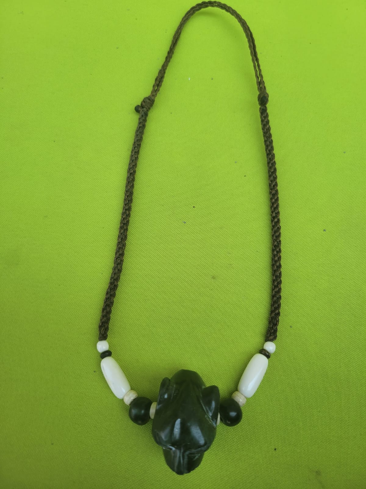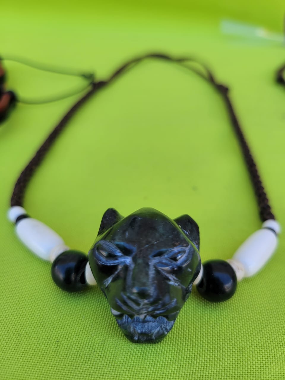 Collar cara de Jaguar de piedra Jade, tejido con hilo encerado, y adornado con cuentas y huesos
