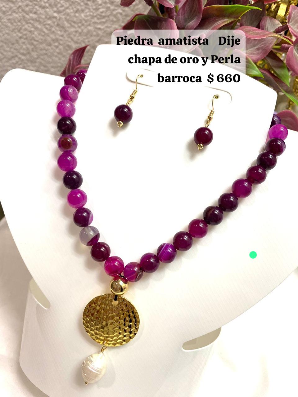 Es un collar con piedras naturales en hermoso color rosa y un dije espectacular de chapa de oro.