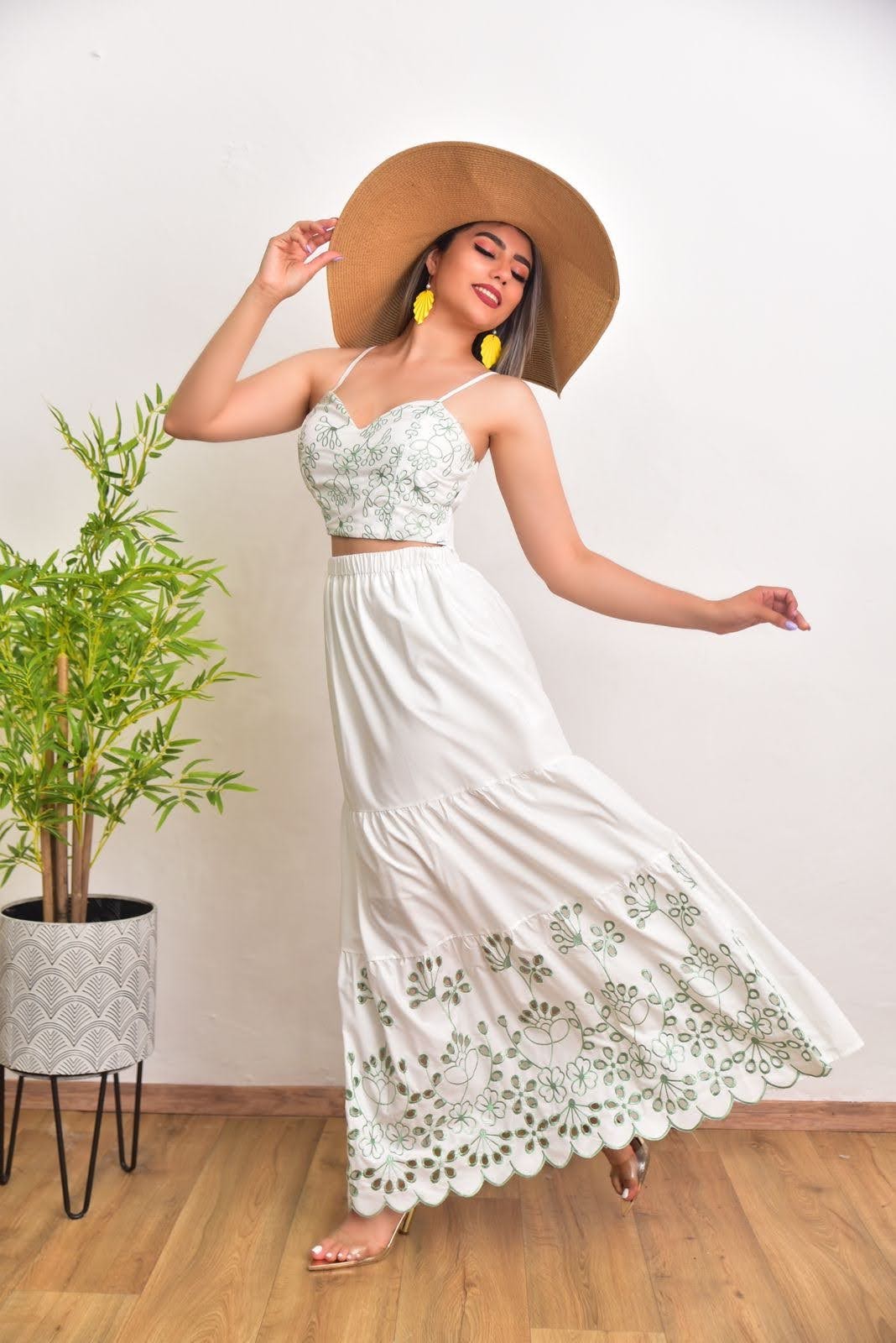 CONJUNTO MAXI FALDA, TOP CON TIRANTES AJUSTABLES. ELASTICO FRUNCIDO EN LA ESPALDA. HERMOSO DETALLE DE BORDADO FLORAL, CORTE AMPLIO TALLA L/XL (ABARCA DE 9 A 13) CALIDAD PREMIUM