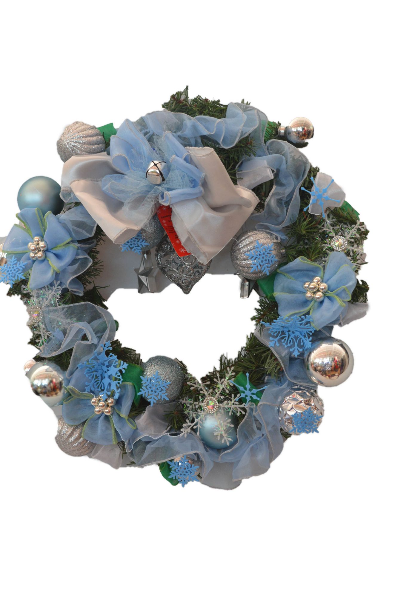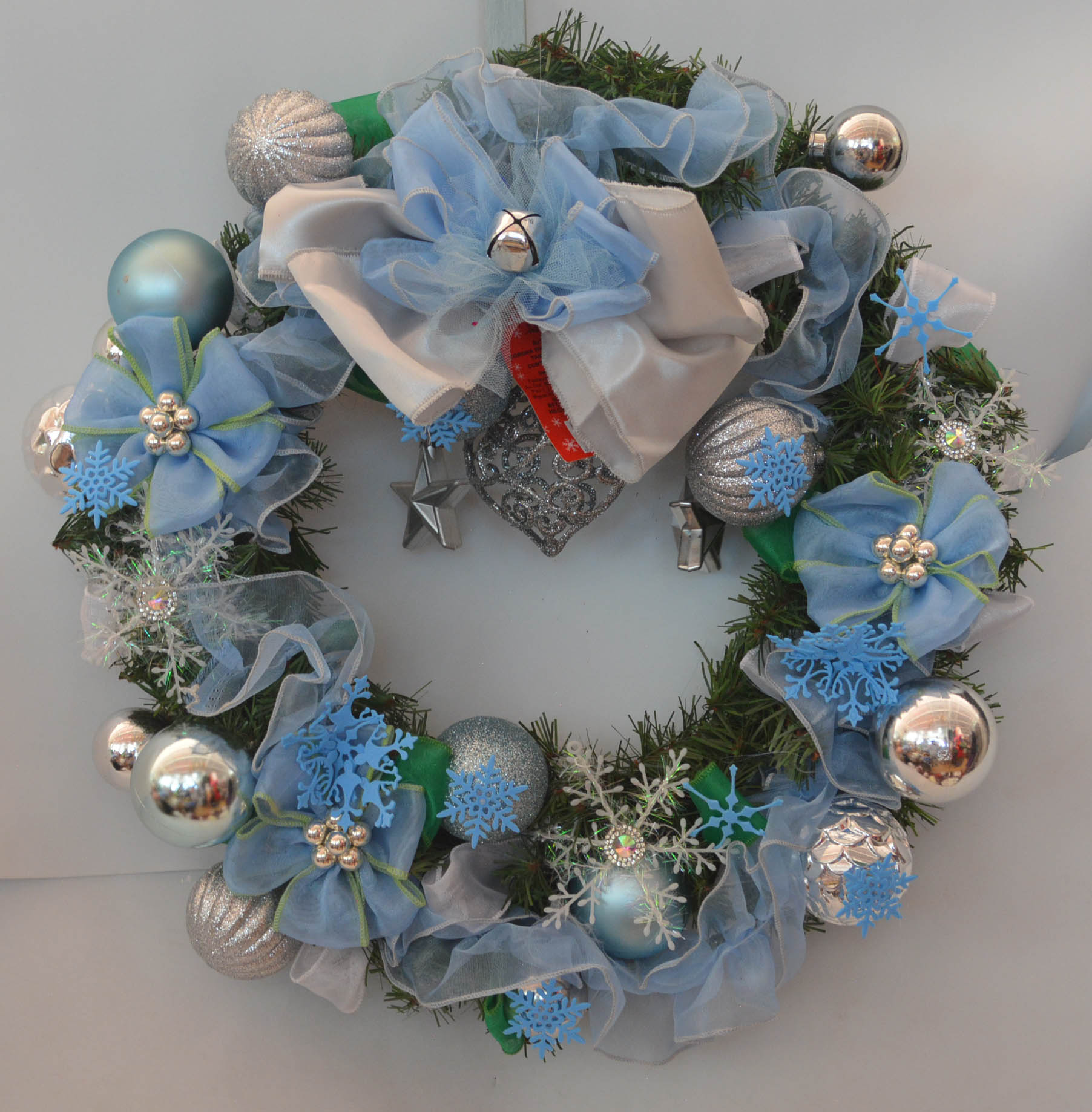 Corona elaborada a mano esferas de plástico, cascabeles y copos de nieve