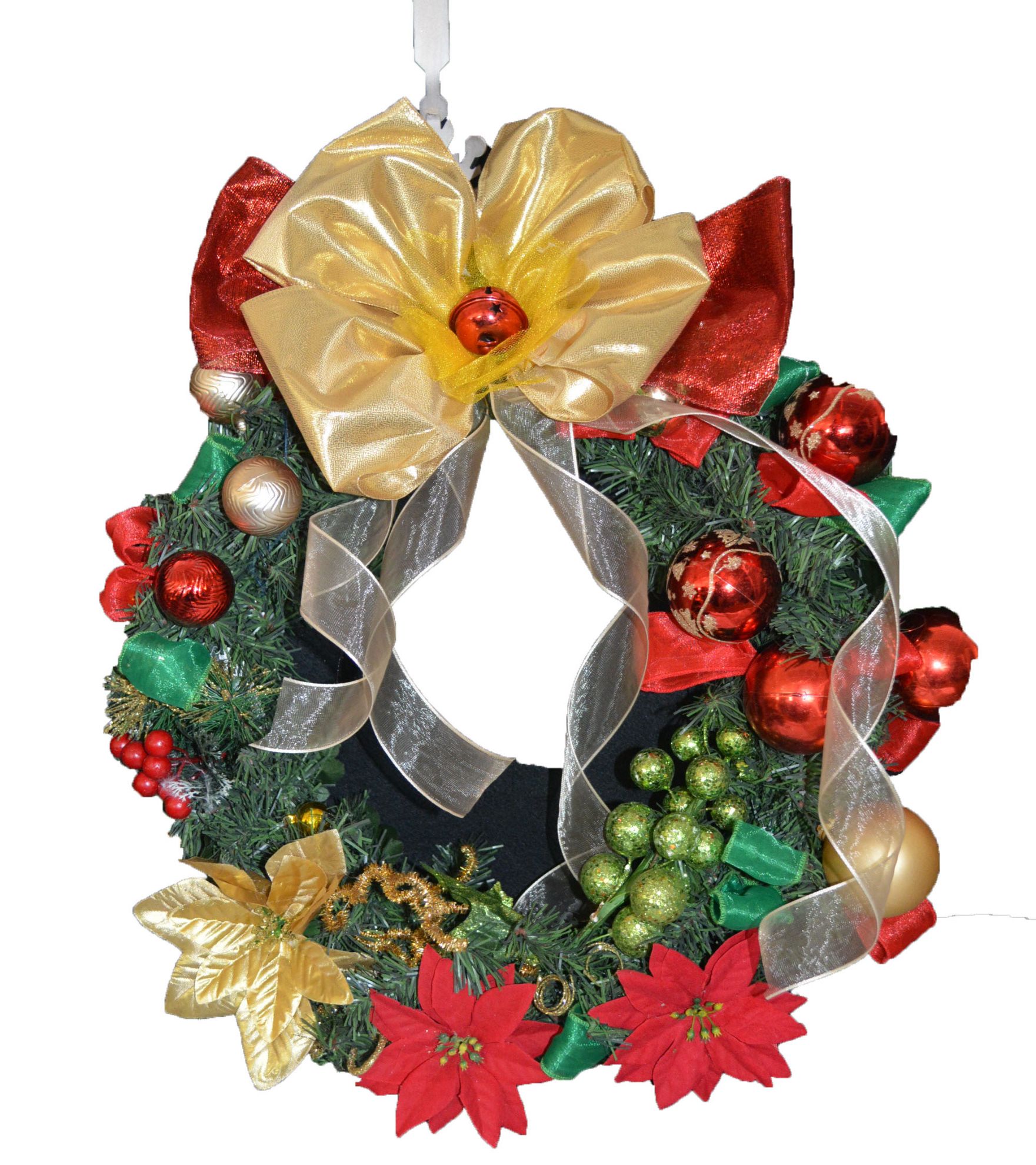 Elaborada con esferas de plástico, cascabeles y nochebuenas