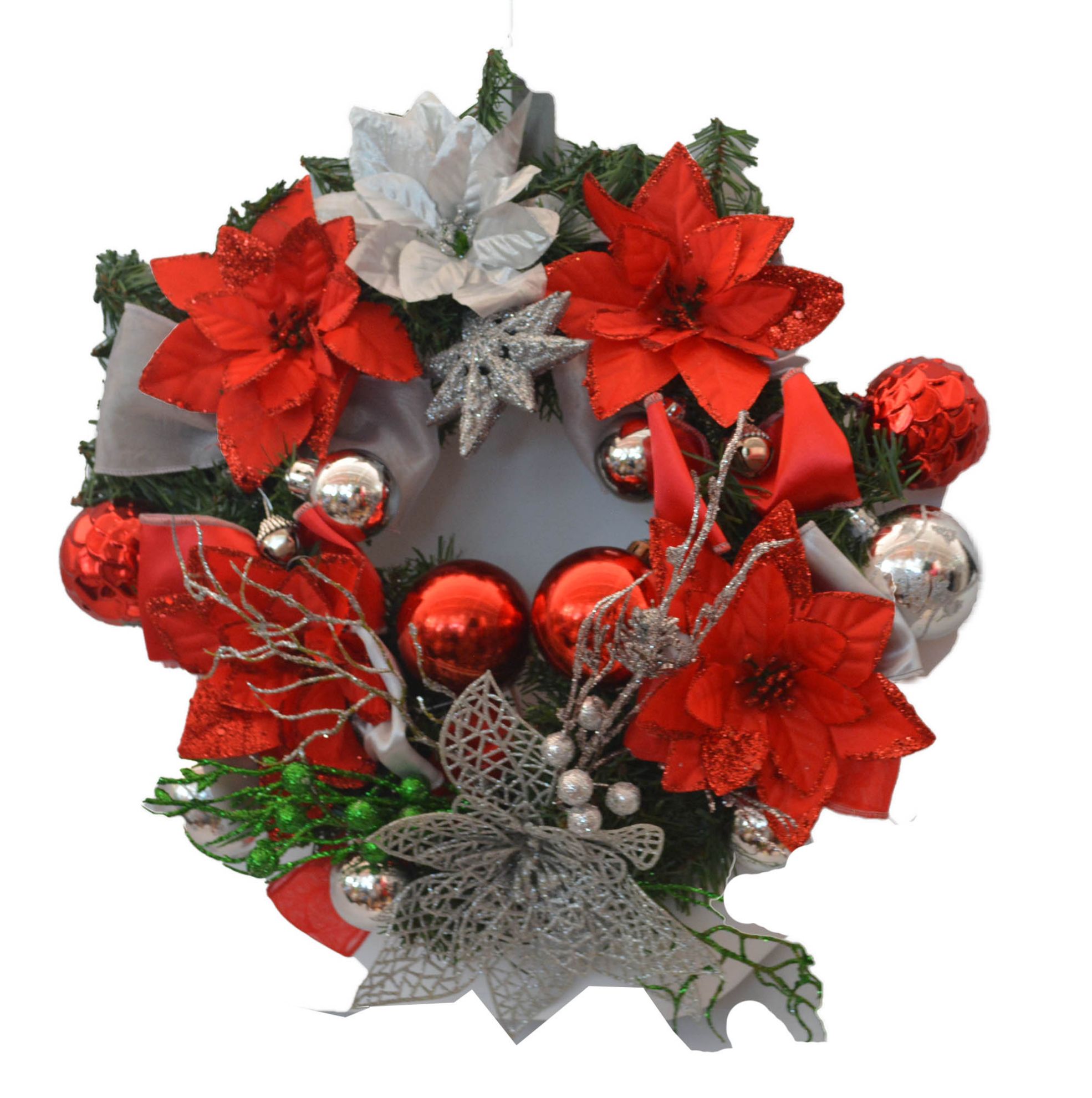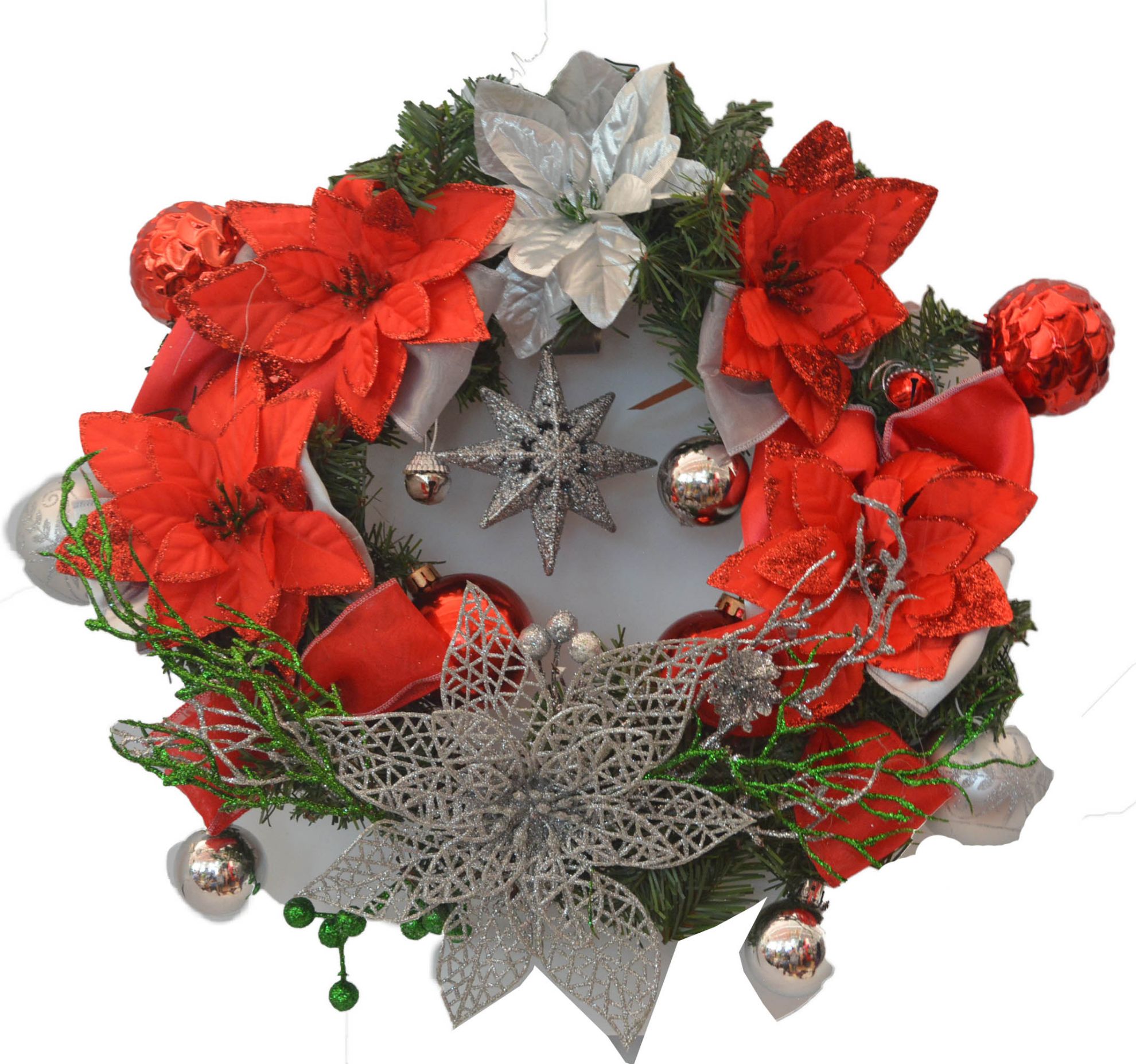 Cuenta con esferas de plástico, cascabeles y copos de nieve