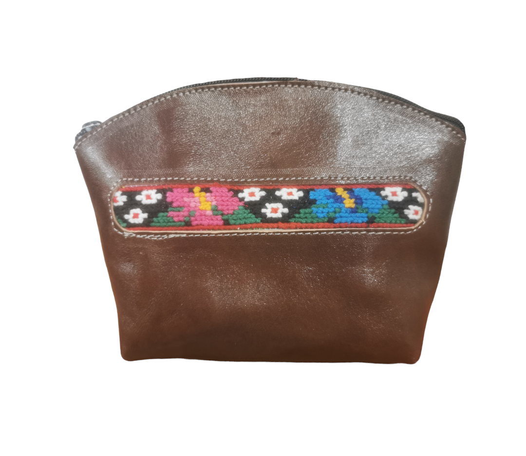 Cosmetiquera elaborada en piel de borrego, con tira bordada en punto de lomillo.