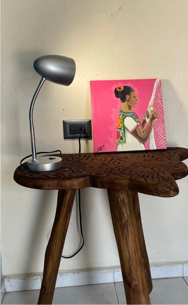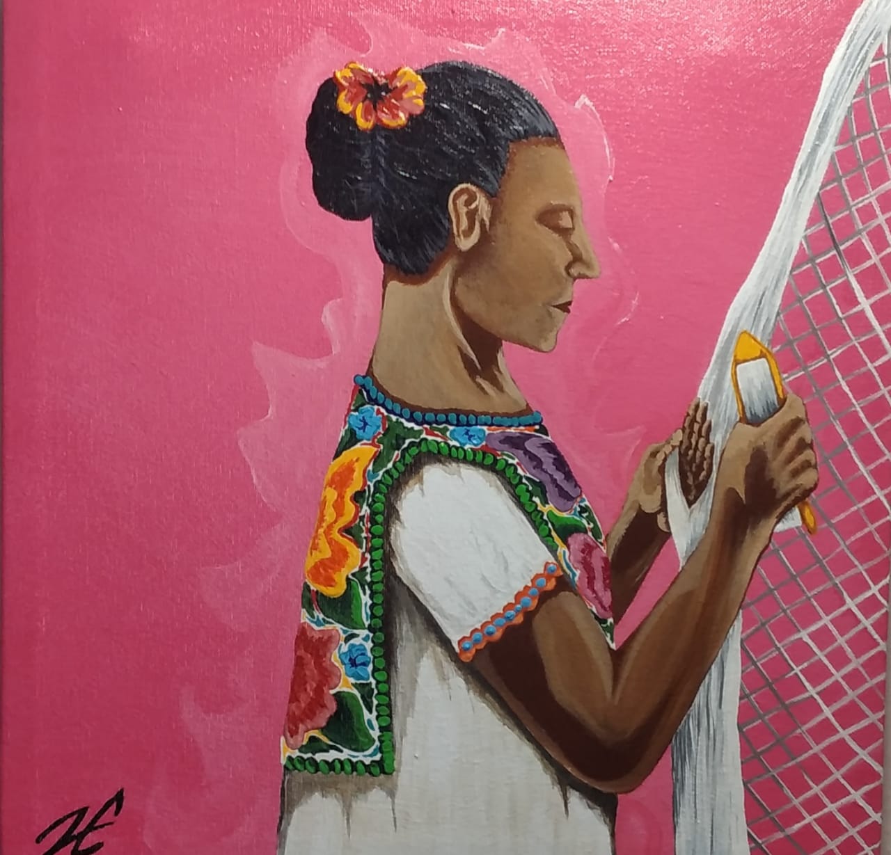Cuadro decorativo elaborado a mano tecnica mixta; Mujer Mestiza bordando, vestida con traje tipico de la region huipil, resaltando los colores alegres de las flores y un fondo en rosa mexicano. Esta obra representa a la mujer maya en uno de sus oficos para apoyar a la economia familiar.