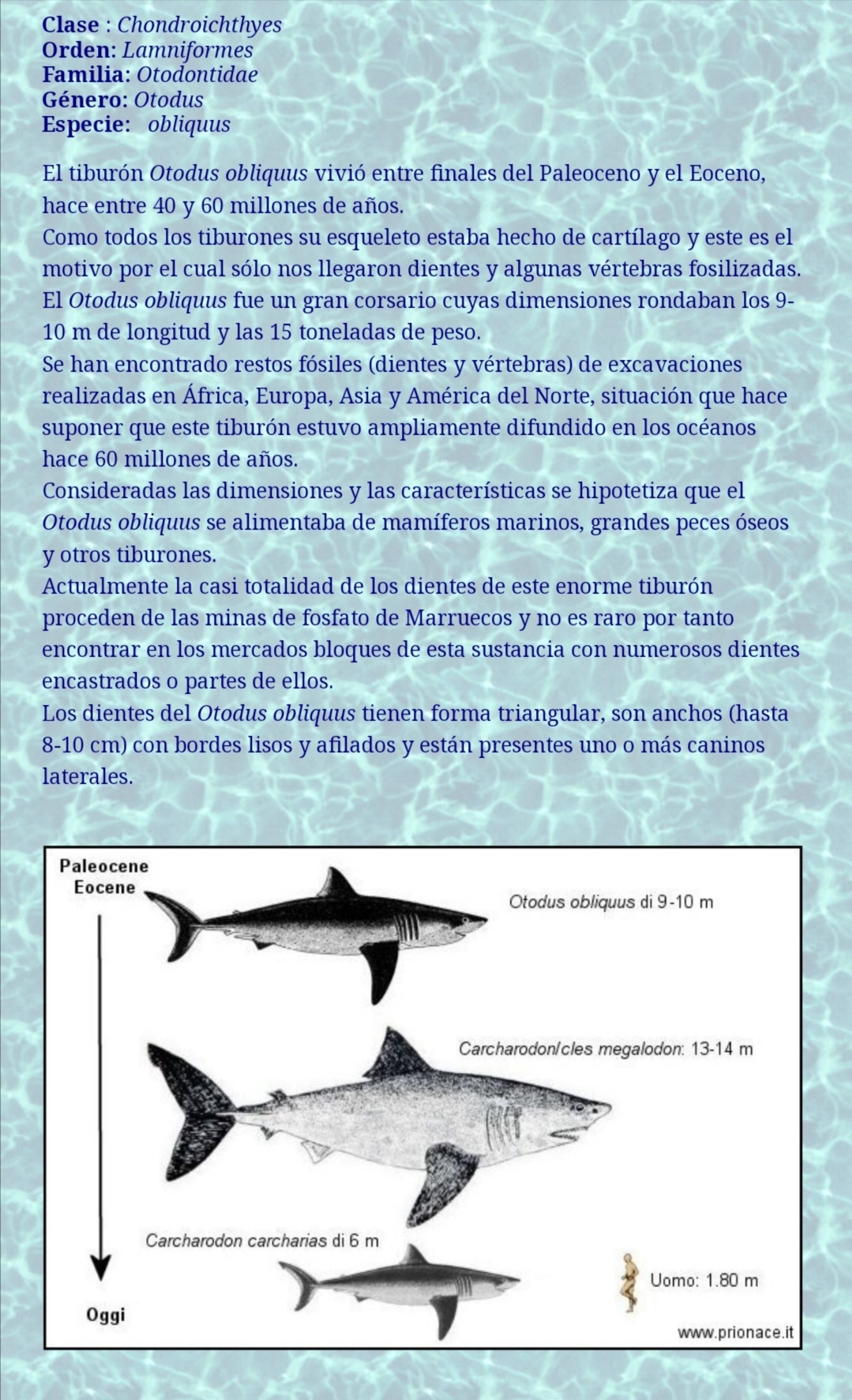 Otodus Obliquss ,es una especie extinta de elasmobranquio lamniforme de la familia otodontidae,de gran tamaño, que vivio durante el paleoceno y el eoceno,hace entre 45 y 55 millones de años.