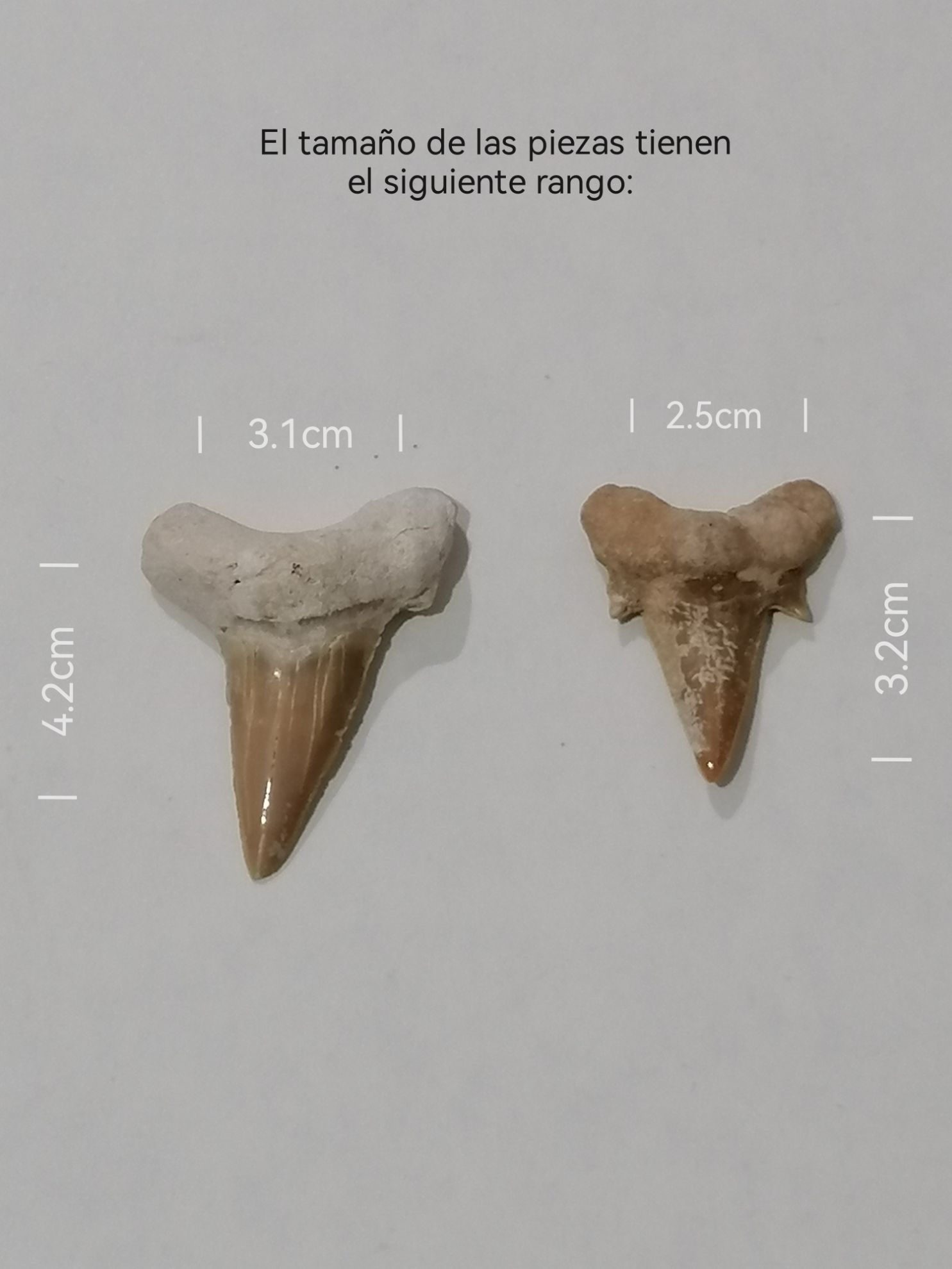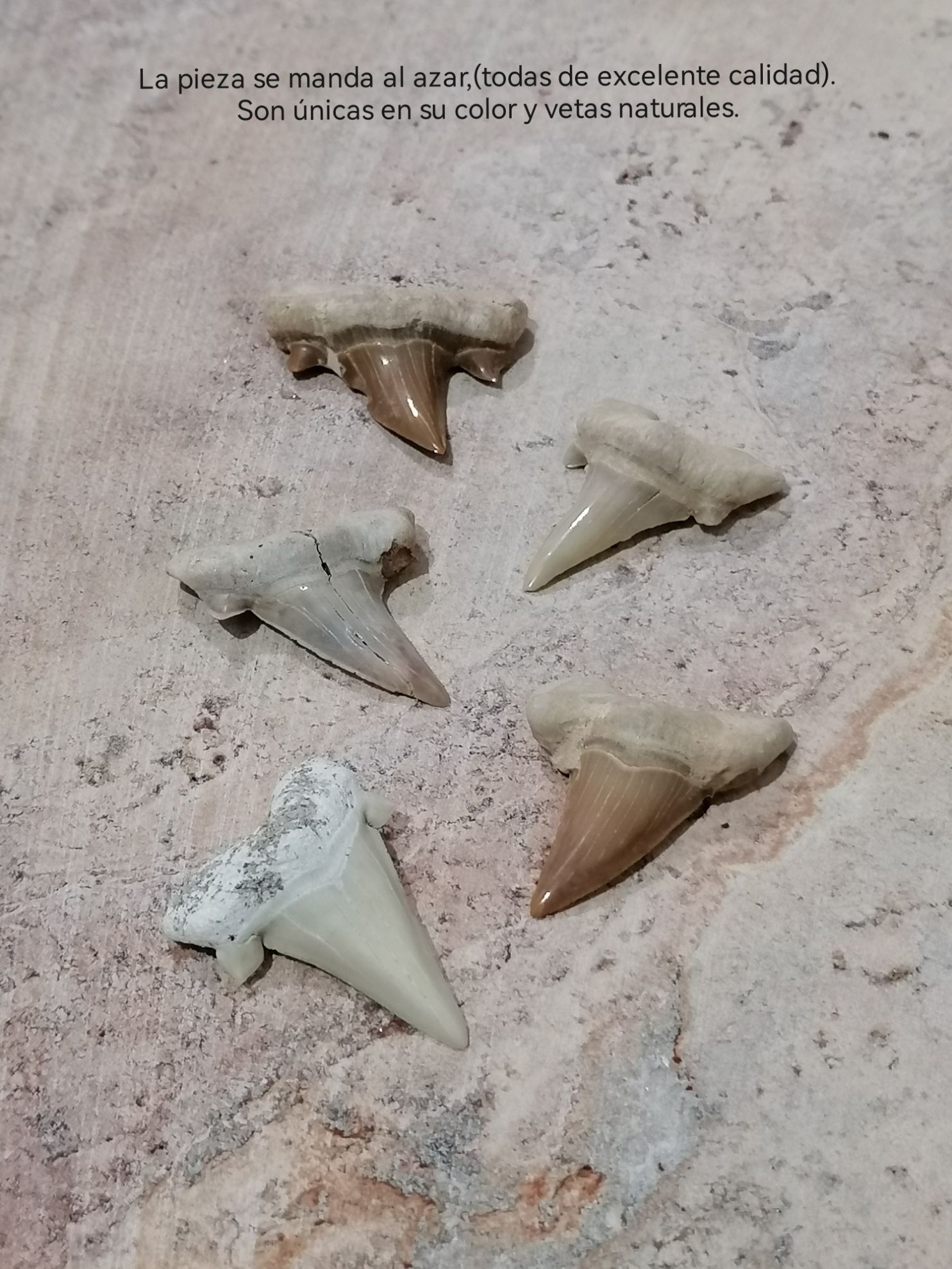 Excavados de las montañas Atlas de Marruecos, estos dientes tienen un hermoso esmalte brillante de color amarillo bronceado a marron y raices calcareas. Despues de mas de 50 millones de años muchos siguen siendo lo suficientemente afilados como para cortar papel.