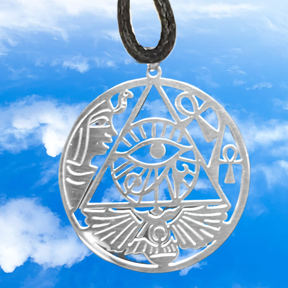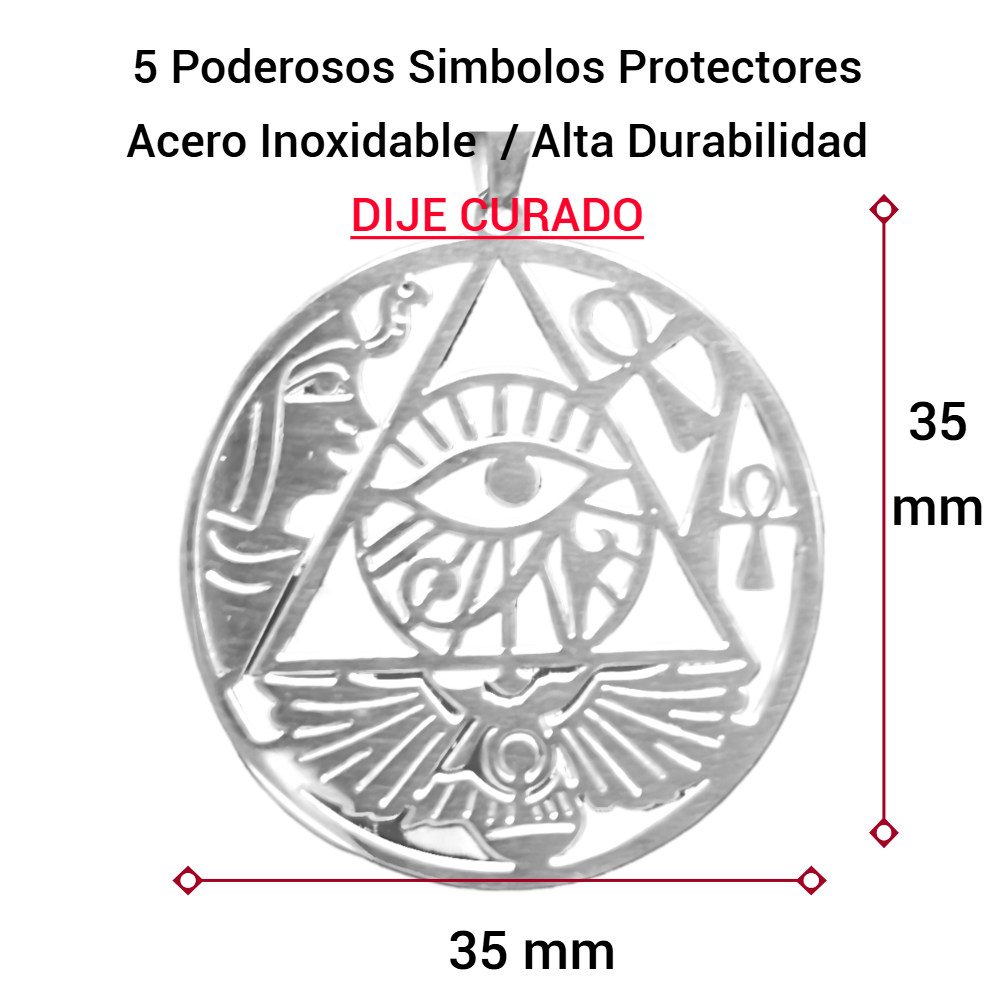 *** 1 Dije Redondo 5 Poderosos Símbolos de Protección Egipcios en Collar Cruz Egipcia + Alas de Aguila + OJO de HORUS + Pirámide y Ojo de Dios + Isis 35X35MM+ ACERO INOXIDABLE ALTA DURABILIDAD ( DIJE CURADO) **