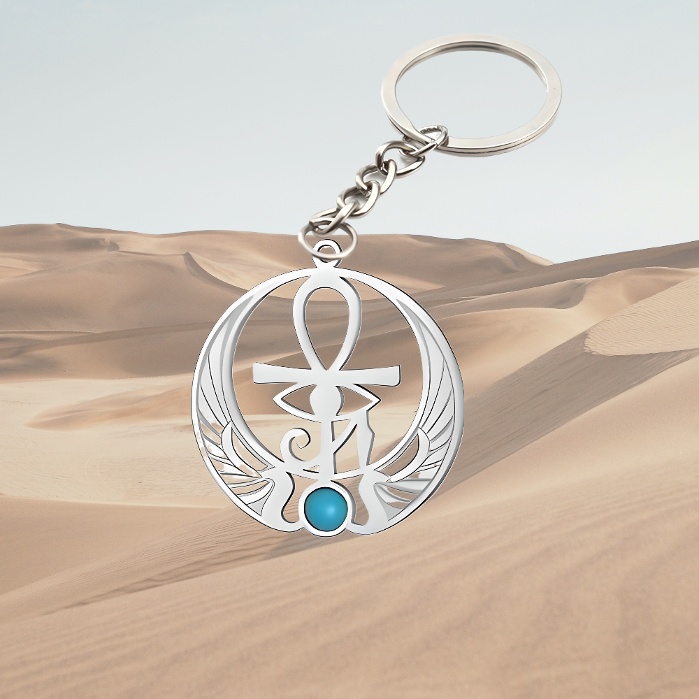 ** 1 Dije Redondo en Llavero Cruz Egipcia o Ankh O Llave de la Vida Con Alas + OJO de HORUS Centro Azul 35X35MM+ ACERO INOXIDABLE ALTA DURABILIDAD ( DIJE CURADO) **