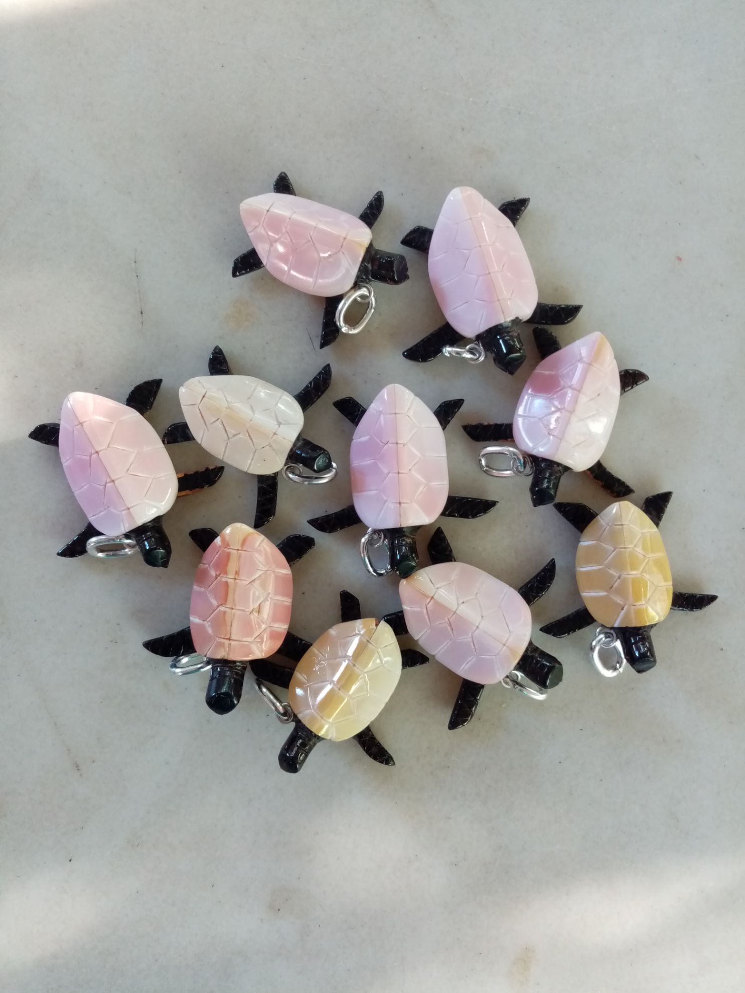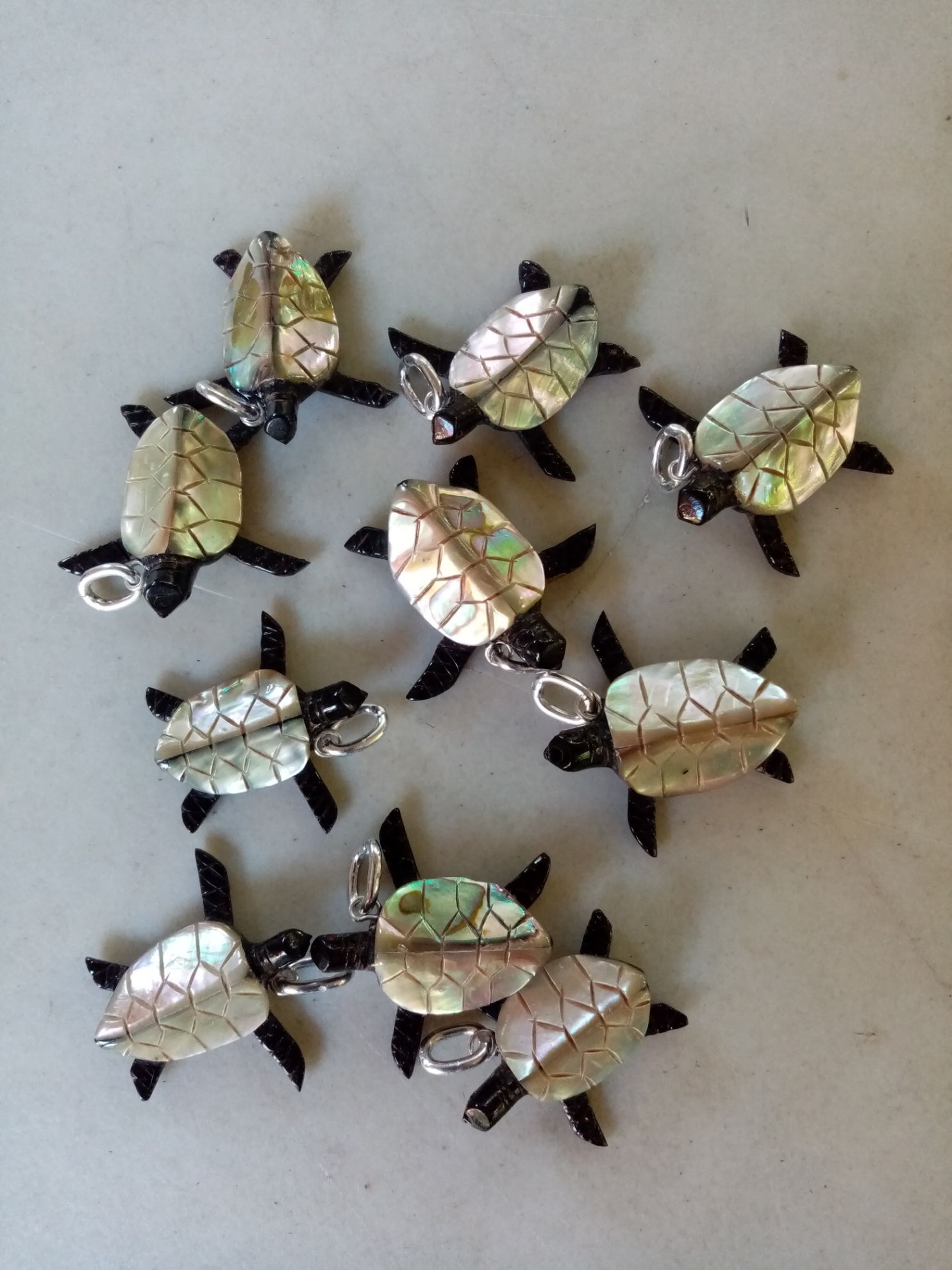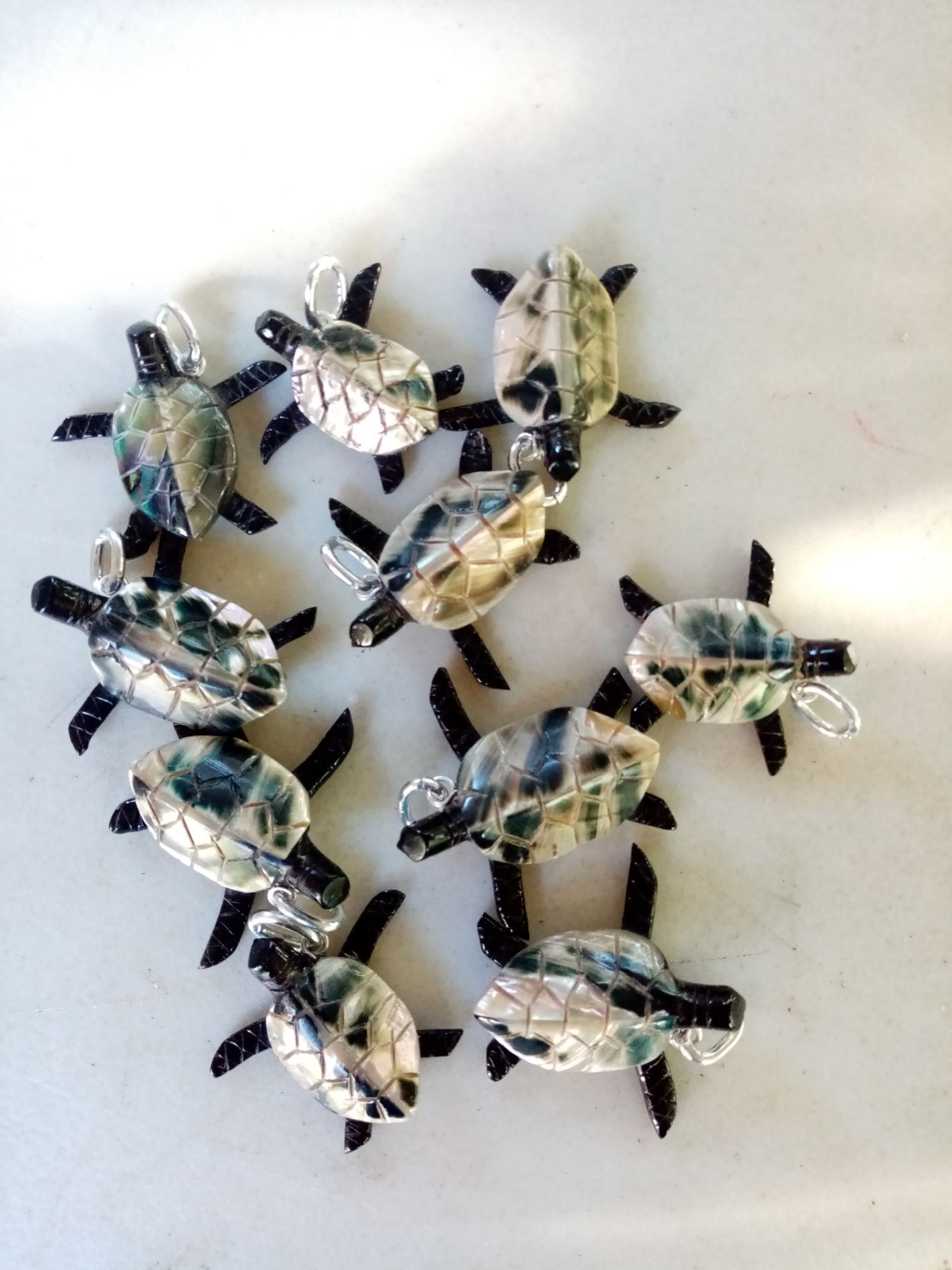 Dije de tortuga de mar. Elaborado de coral negro con concha de abulón. Con pija de aluminio.
