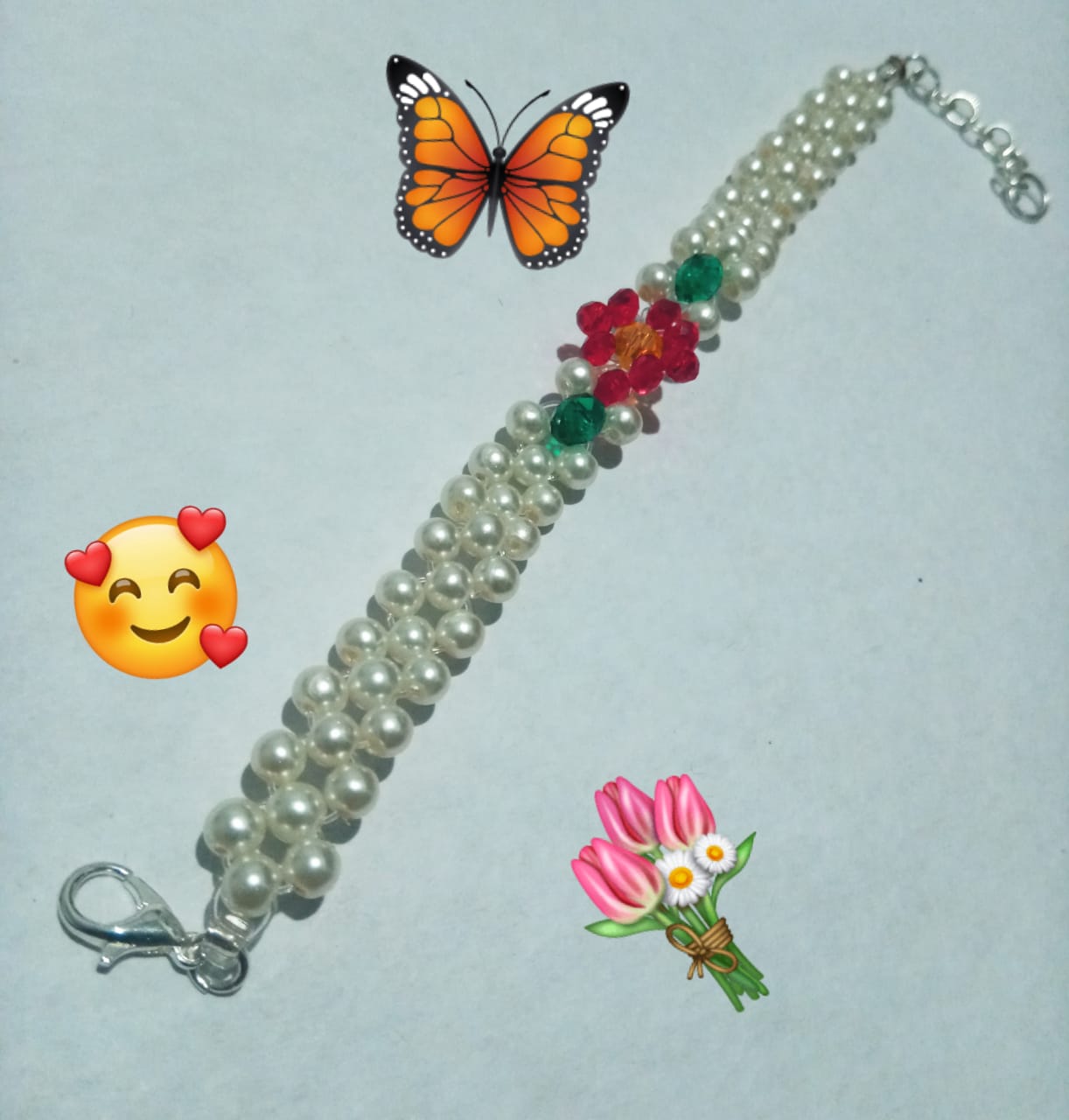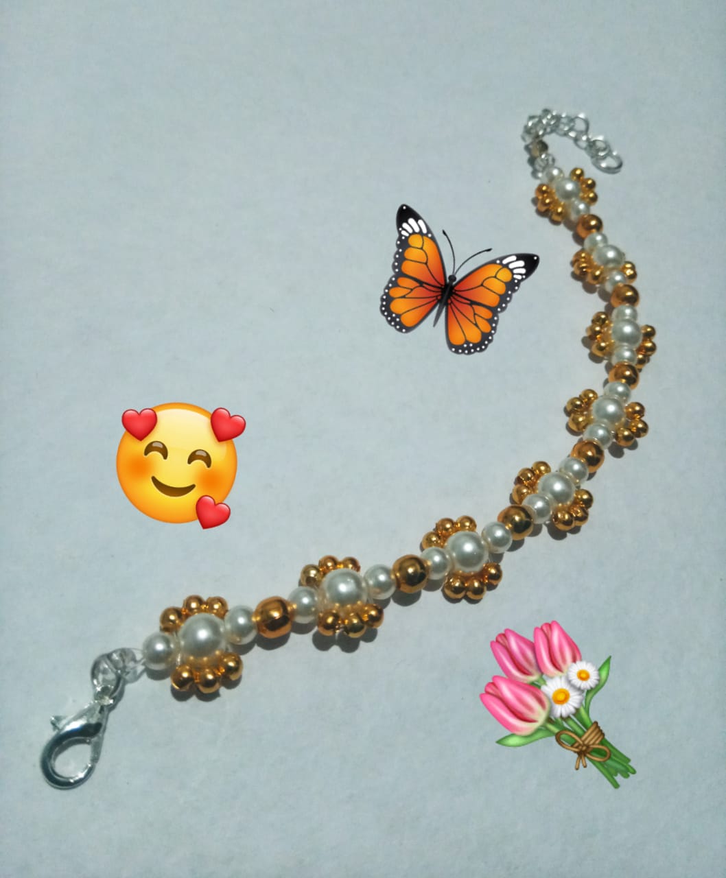 Set de 2 pulseras elaboradas con cuentas de perlas de fantasia color nacar de longitud 17 cm extendible a 21 cm aproximadamente, terminacion con ganchito de un lado y cadenita del otro.