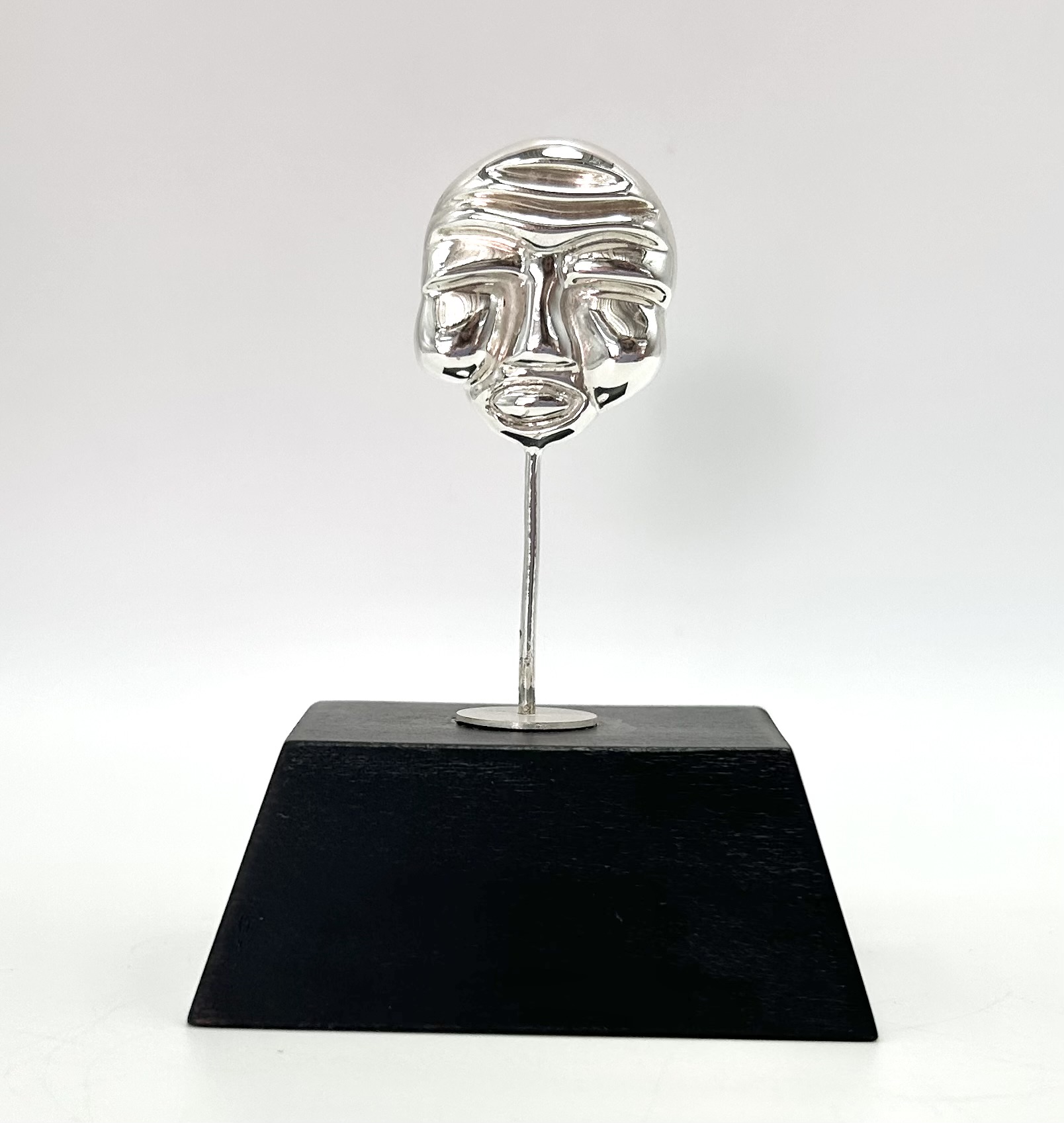 Medidas: Altura 8.5 cm (pieza y madera) Pieza de plata: altura 5.5/ ancho rostro: 2.7cm/ Perimetro madera 20.cm