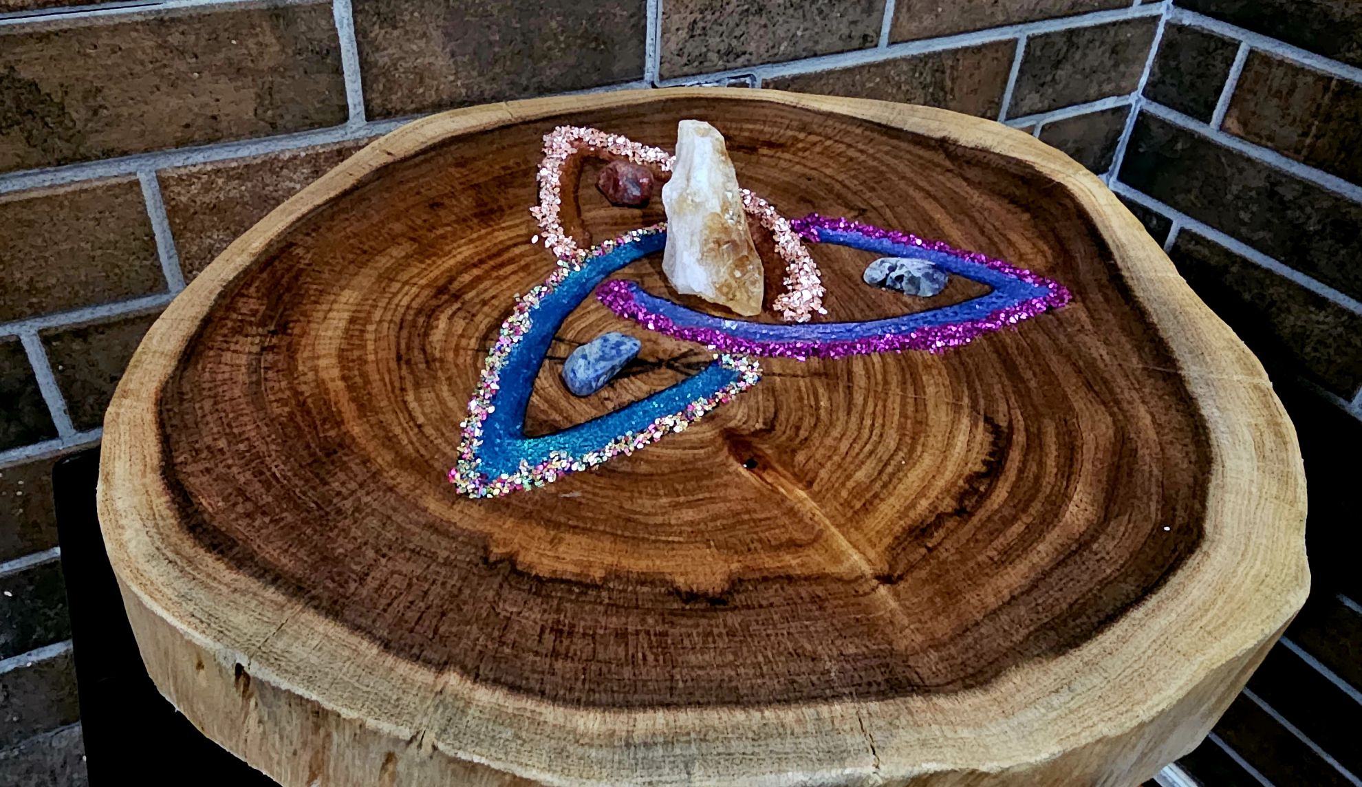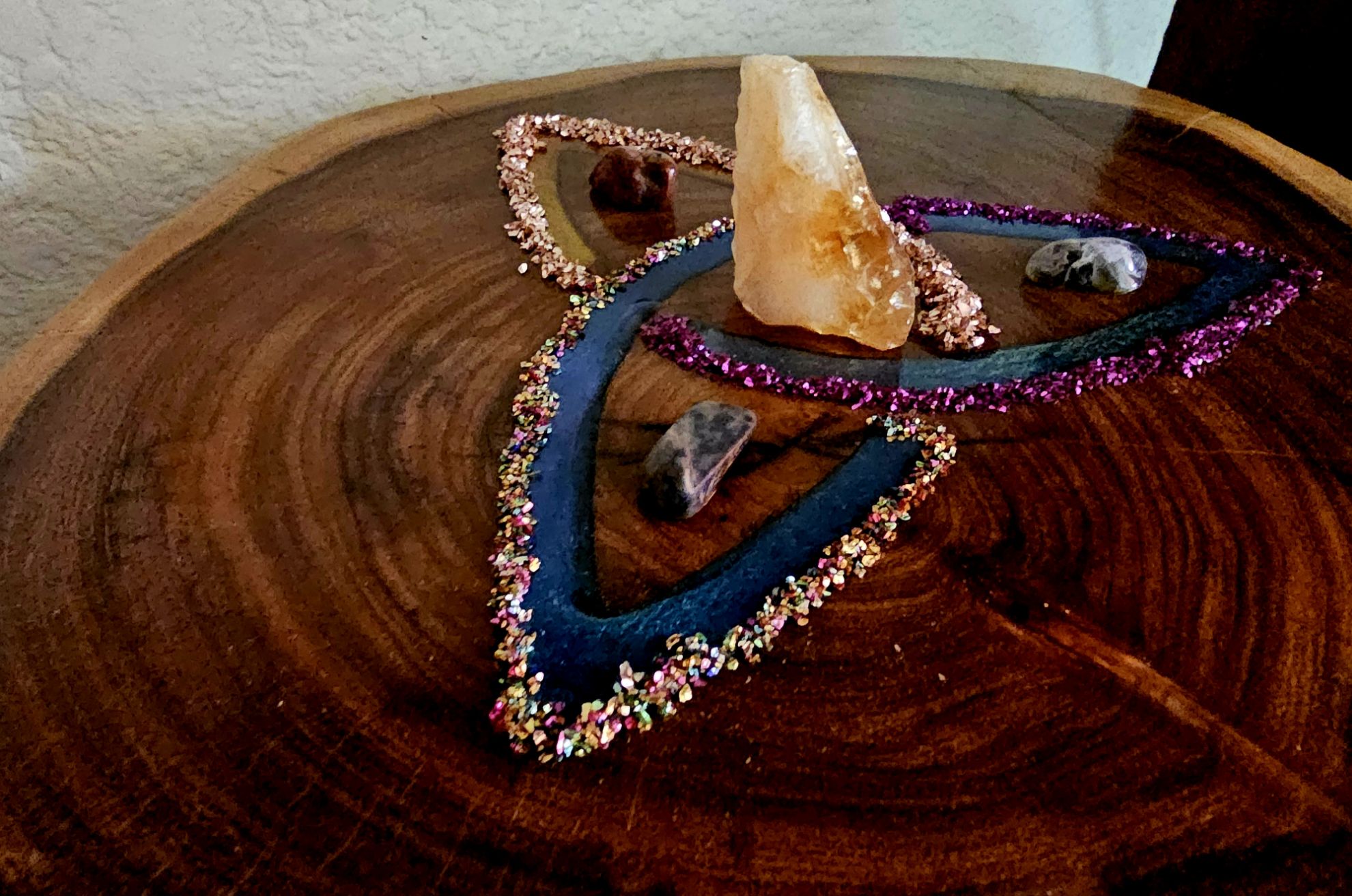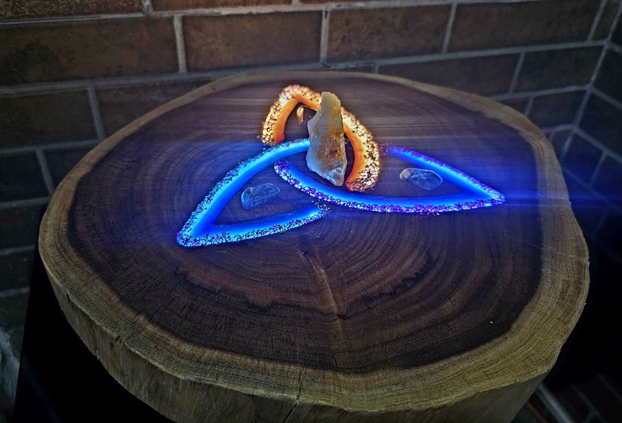 Hermosa Pieza decorativa para hogar y oficinia. Elaborada en una rodaja de Madera de Tzalam, en su centro se colocó una punta de Cuarzo Citrino acompañada con cuarzos diferentes en las puntas de la Runa. Cuenta con fuente de luz led lo que le hace resaltar más sus atributos.
