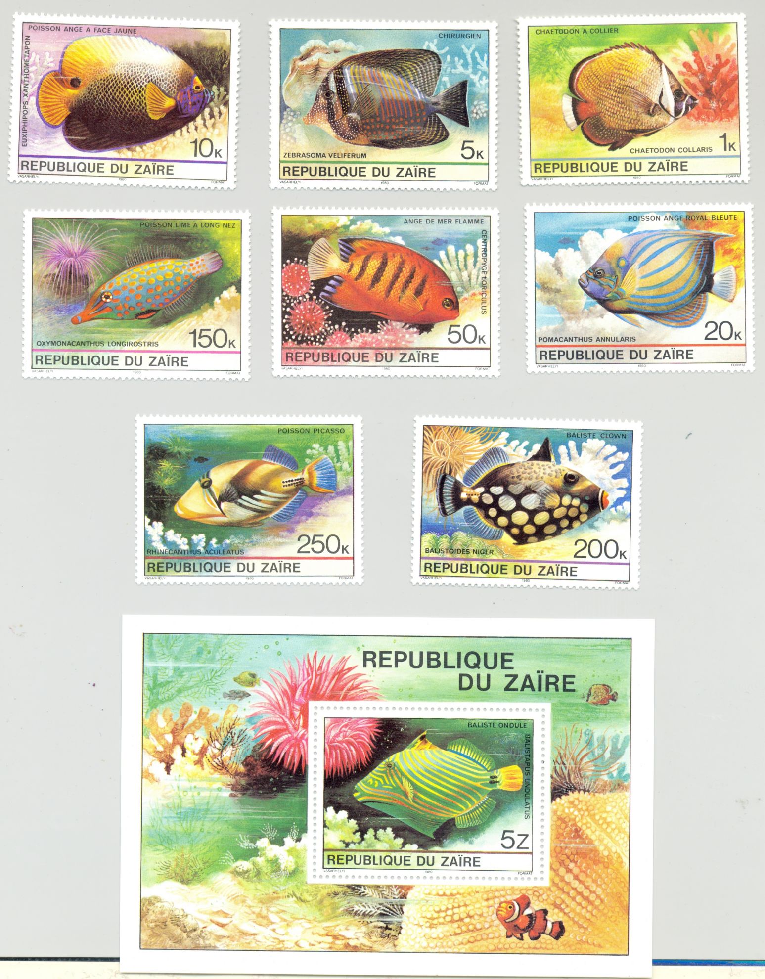 ESTAMPILLAS DE ZAIRE AFRICA SERIE PECES CON HOJITA SOUVENIR 1980