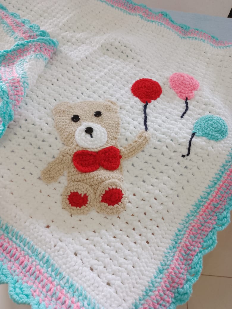 Frazada para bebé tejida a mano con estambre hipoalergénico, estambre color blanco, con orillas en color azul y rosa, decorada con oso en una esquina.