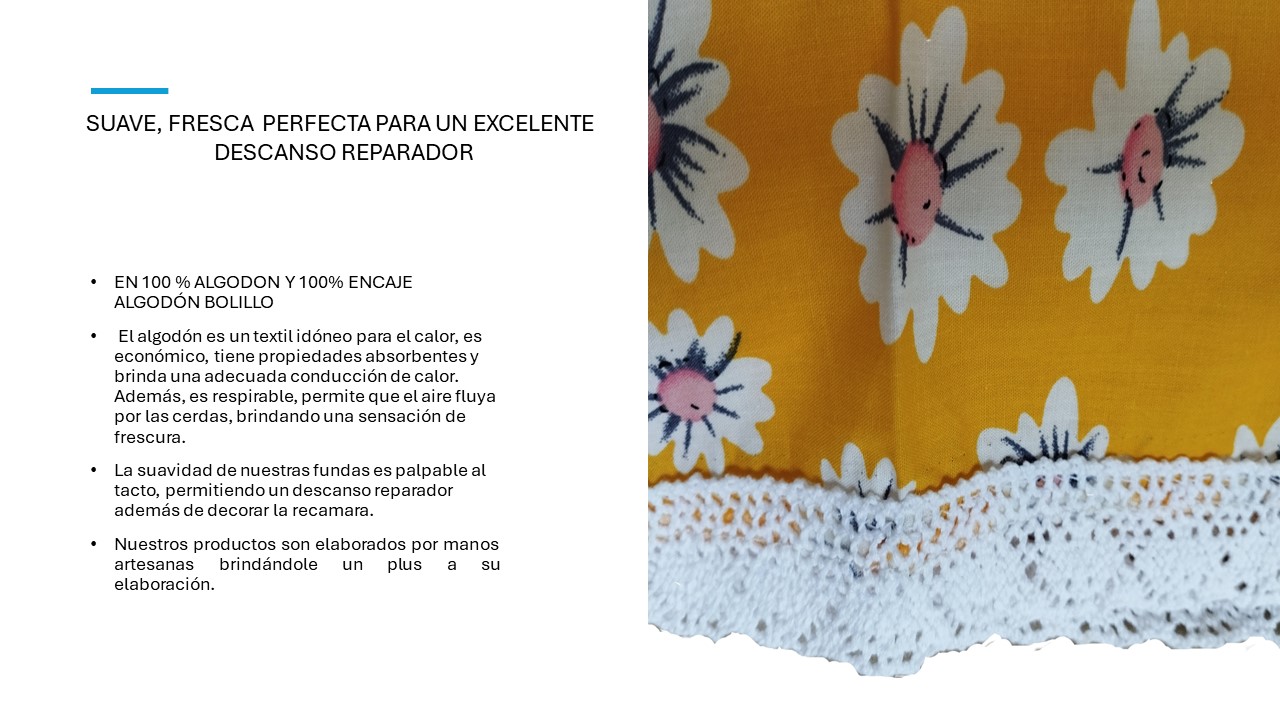 SUAVE, FRESCA EN 100 % ALGODON,  CON  ENCAJE EN LA ORILLA BOLILLO ALGODON 100%,   El algodón es un textil idóneo para el calor, es económico, tiene propiedades absorbentes y brinda una adecuada conducción de calor. Además, es respirable, permite que el aire fluya por las cerdas, brindando una sensación de frescura.