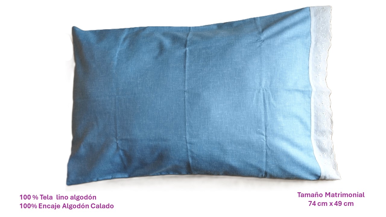 FUNDA PARA ALMOHADA MATRIMONIAL 100% LINO Y 100 % ALGODON (AZUL -ENCAJE CALADO BLANCO)