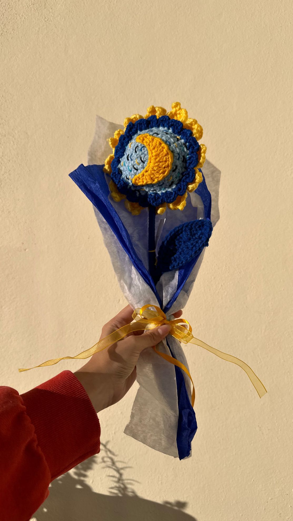 Este girasol de crochet es una obra de arte en miniatura, que combina la belleza de la naturaleza con la inspiración de uno de los cuadros más icónicos de Vincent van Gogh, La noche estrellada. Los pétalos están tejidos en un amarillo brillante, cuidadosamente diseñados para imitar el aspecto radiante y natural de un girasol en plena floración. En el centro, el trabajo de crochet recrea la esencia del cielo nocturno de Van Gogh, con sus remolinos y estrellas, logrando un efecto visualmente impactante y lleno de simbolismo. La mezcla de tonos azul profundo, blanco y amarillo en el centro tejido hace que este girasol sea una pieza cautivadora, ideal para decorar cualquier espacio o como un regalo artístico y original para los amantes de la artesanía y el arte clásico.