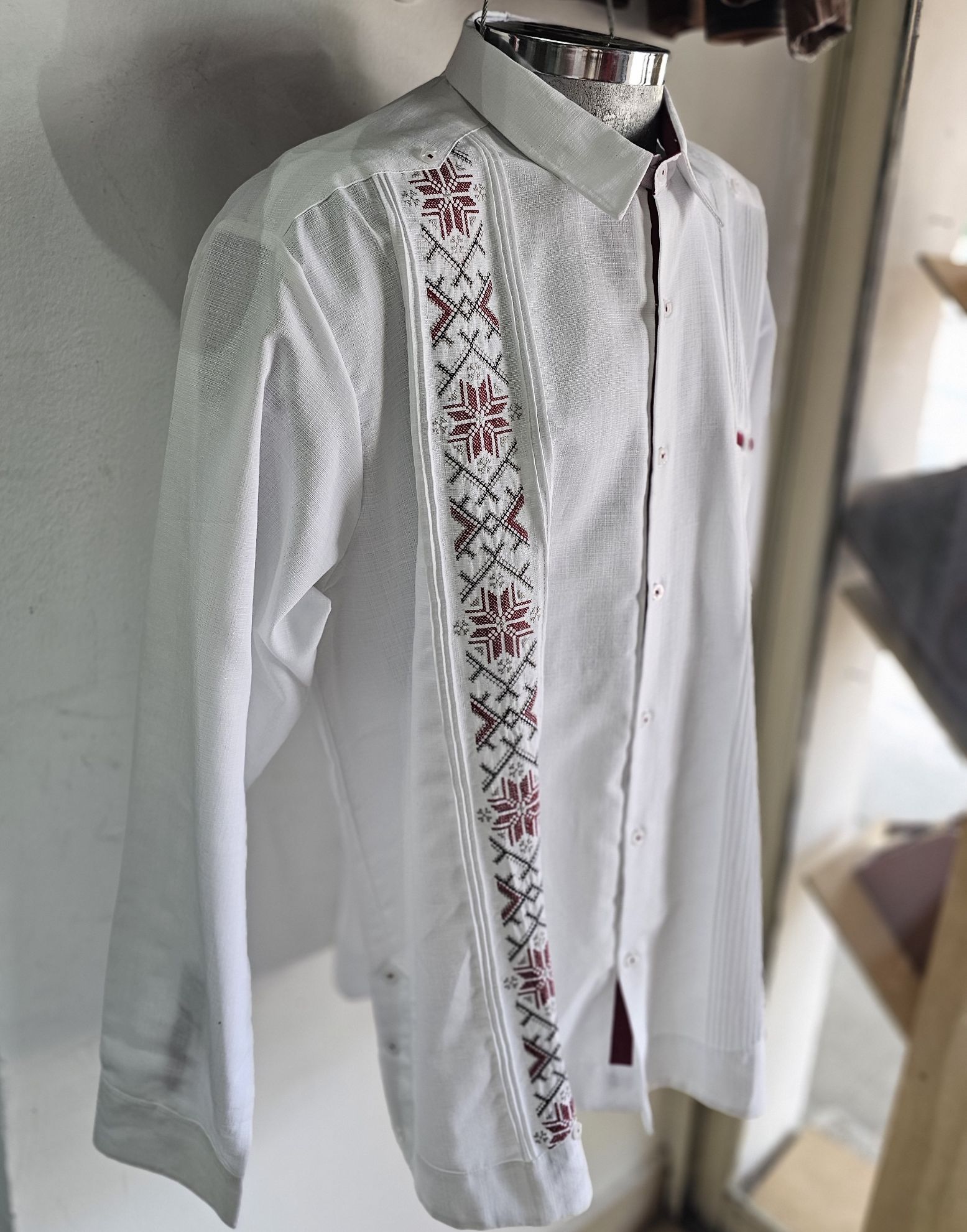 Elegante Guayabera de Lino con Bordado Carmesí Modelo Embajador Manga Larga. 100% lino nacional. Para ocasiones especiales. Atractivo dideño