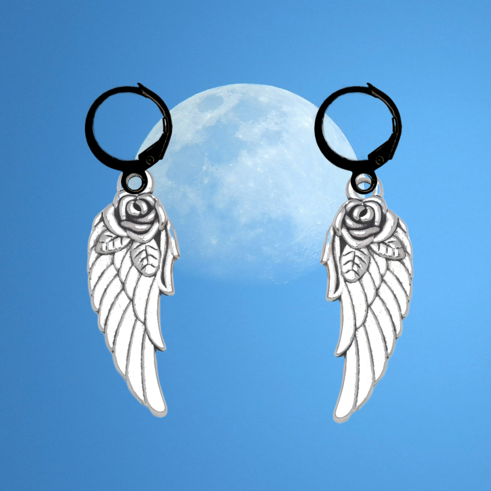 1 Par de Arracaditas Negras Con Alas de Angel Medianas con Rosa color plata Color Plata 31X11mm
