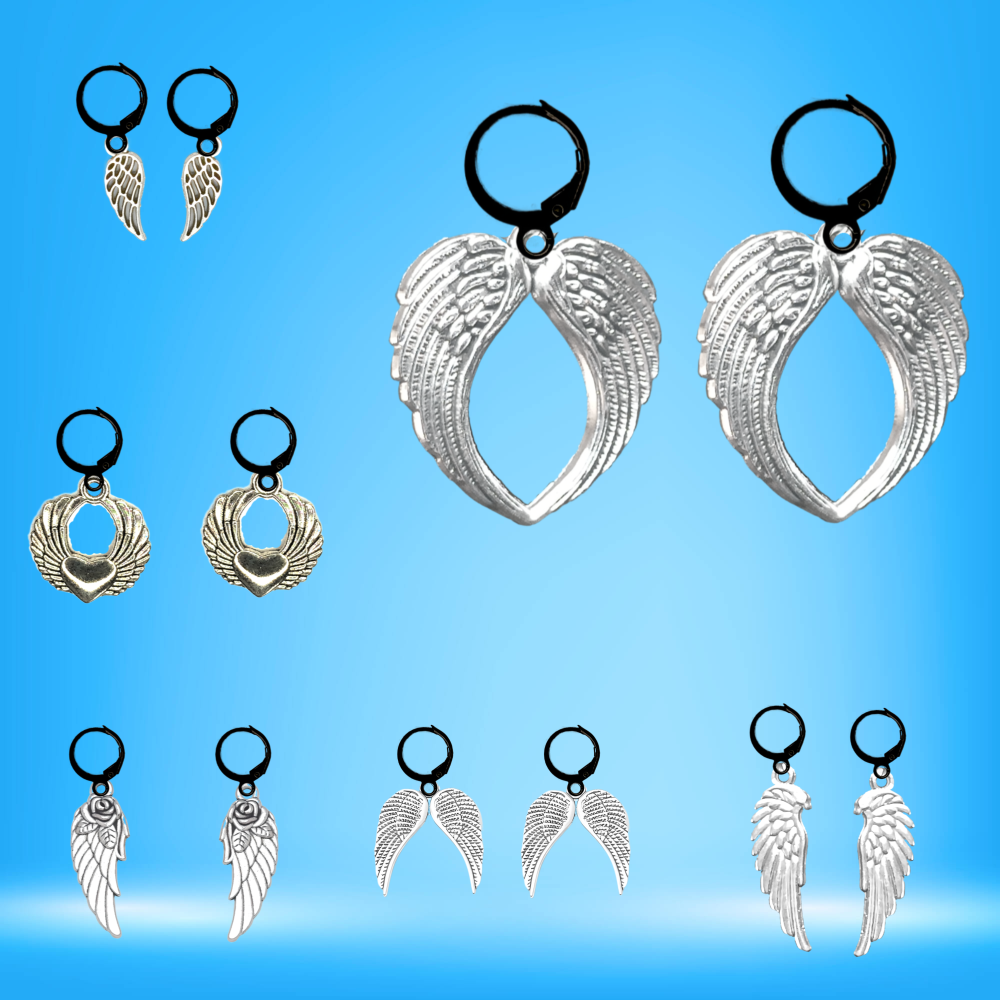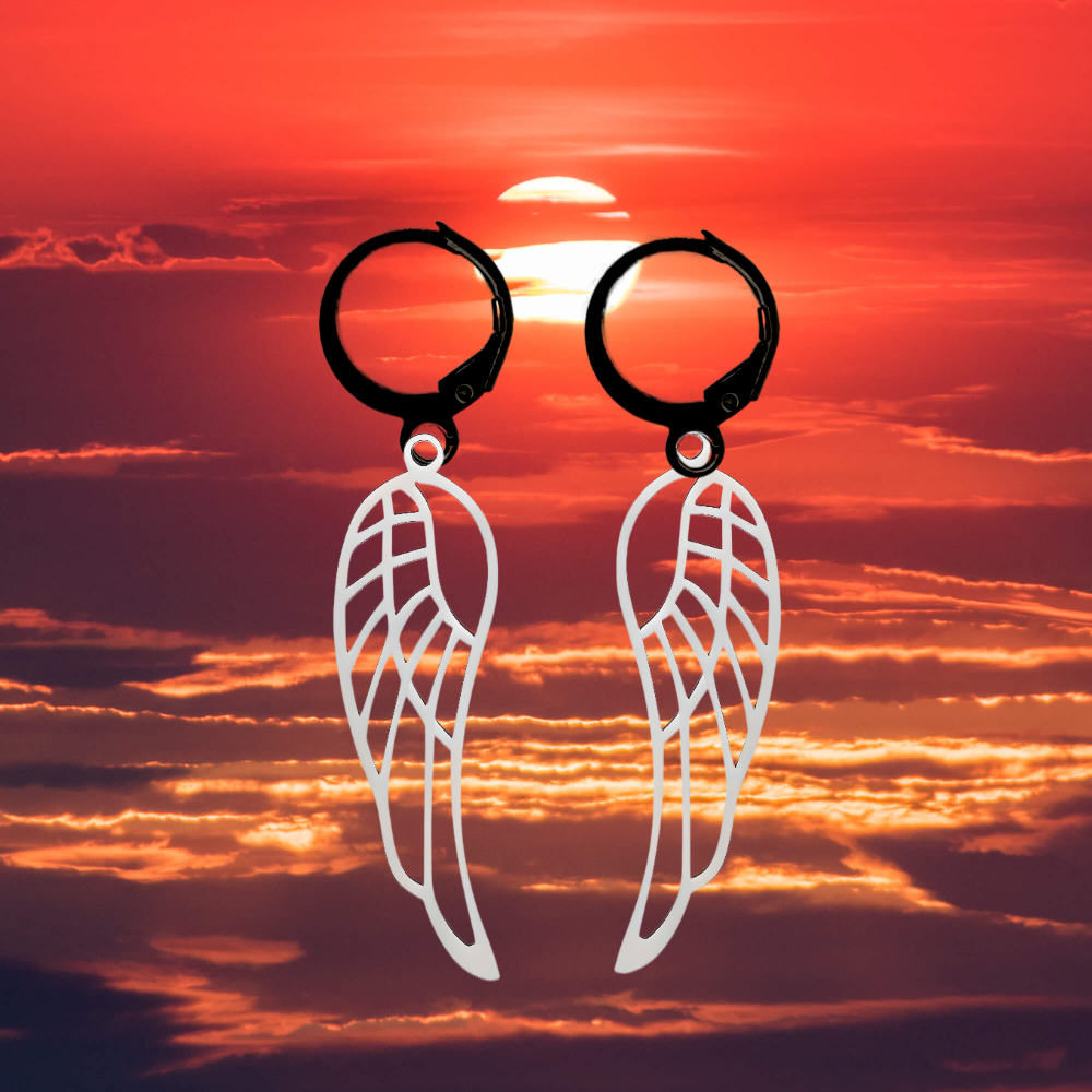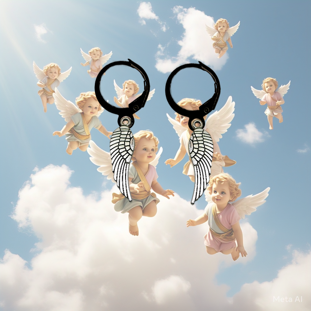 1 Par de Arracaditas Negras Con Alas de Angel Chicas Ranuradas Color plata 11X4mm