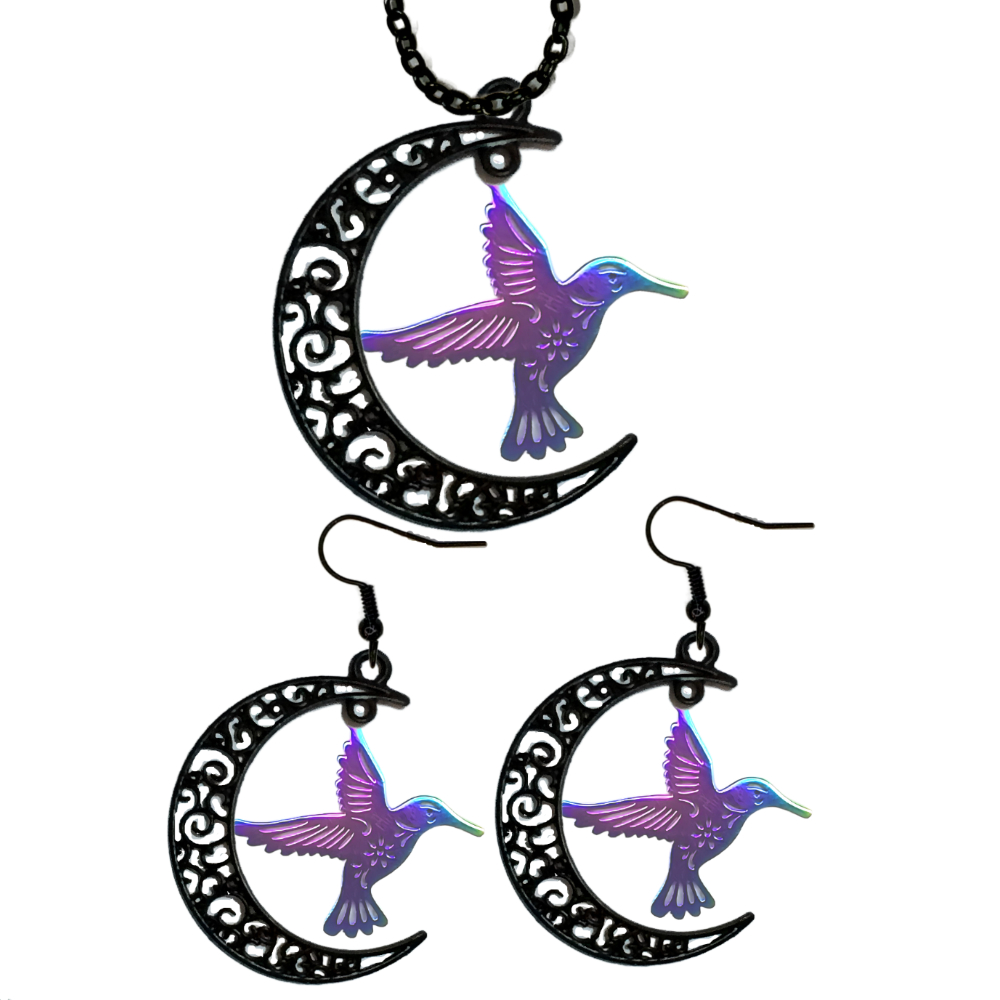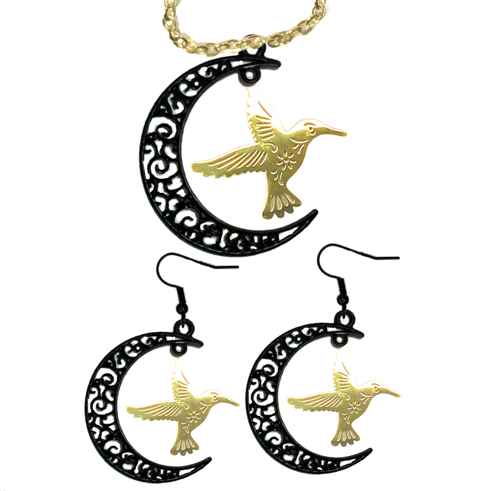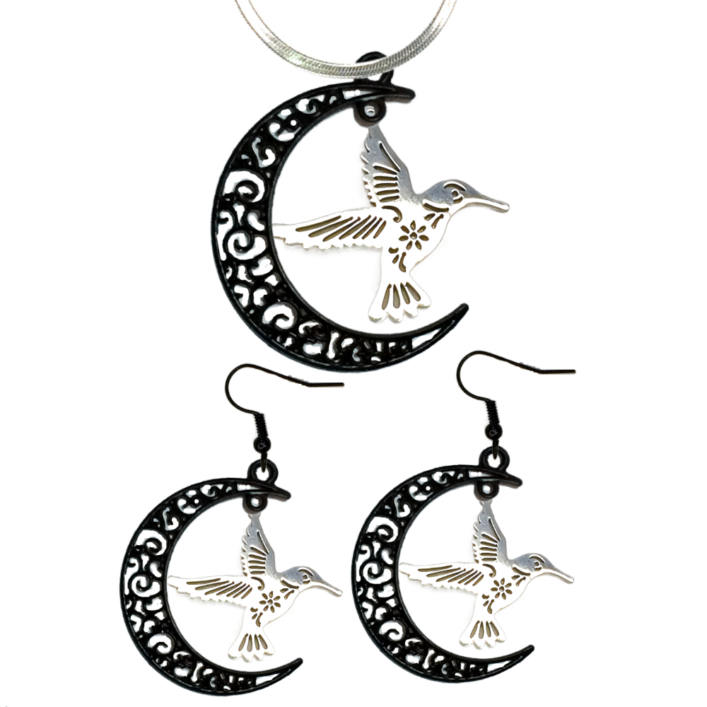 ******1 Juego (Aretes y Dije en Collar) de Hermoso Colibr Detallado Grande M3 40x35mm Acero Color Plata Acero Alta Durabilidad en Luna Creciente Negra 41x31mm