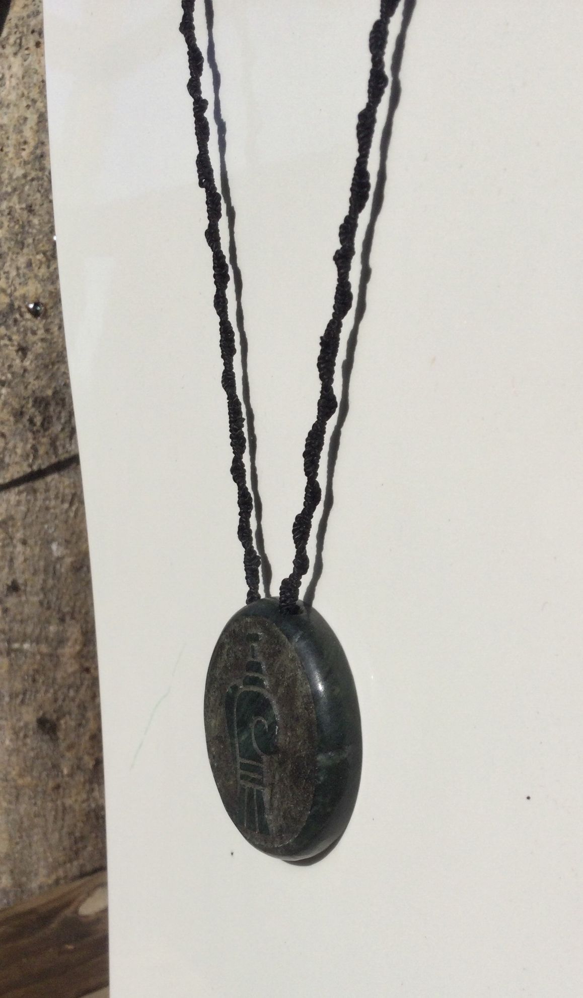 El collar está hecho con piedra serpentina estilo jade guatemalteco de alta calidad, y lleva un símbolo de la Palabra grabado en una piedra de 50 mm. El collar es tejido a mano resistente y mide 24 pulgadas (60 cm) de largo. Los colores y tamaños están disponibles según preferencias.