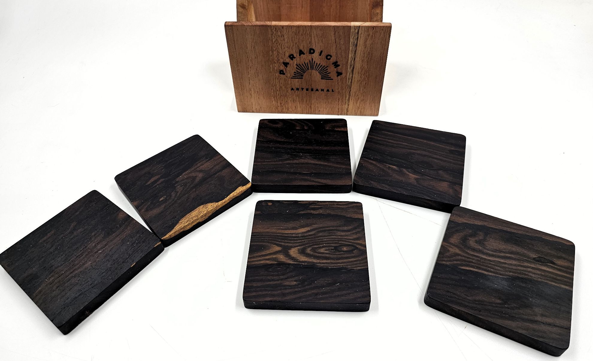 Hermoso juego de 6 Posavasos elaborados con una de las maderas más duras de América Latina, Ziricote. Además de dura su color es único, en las imagenes se muestra el color natural de la beta de esta madera. Gracias a la densidad de las fibras no absorben humedad, olor o color alguno. La base esta elaborada en madera de Cedro.
