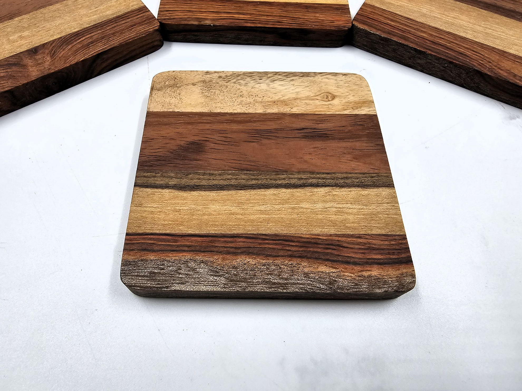 Hermosos juegos de 6 posavasos elaborados con maderas tropicales exoticas como : Chechen, Bojon, Javin y Cedro
