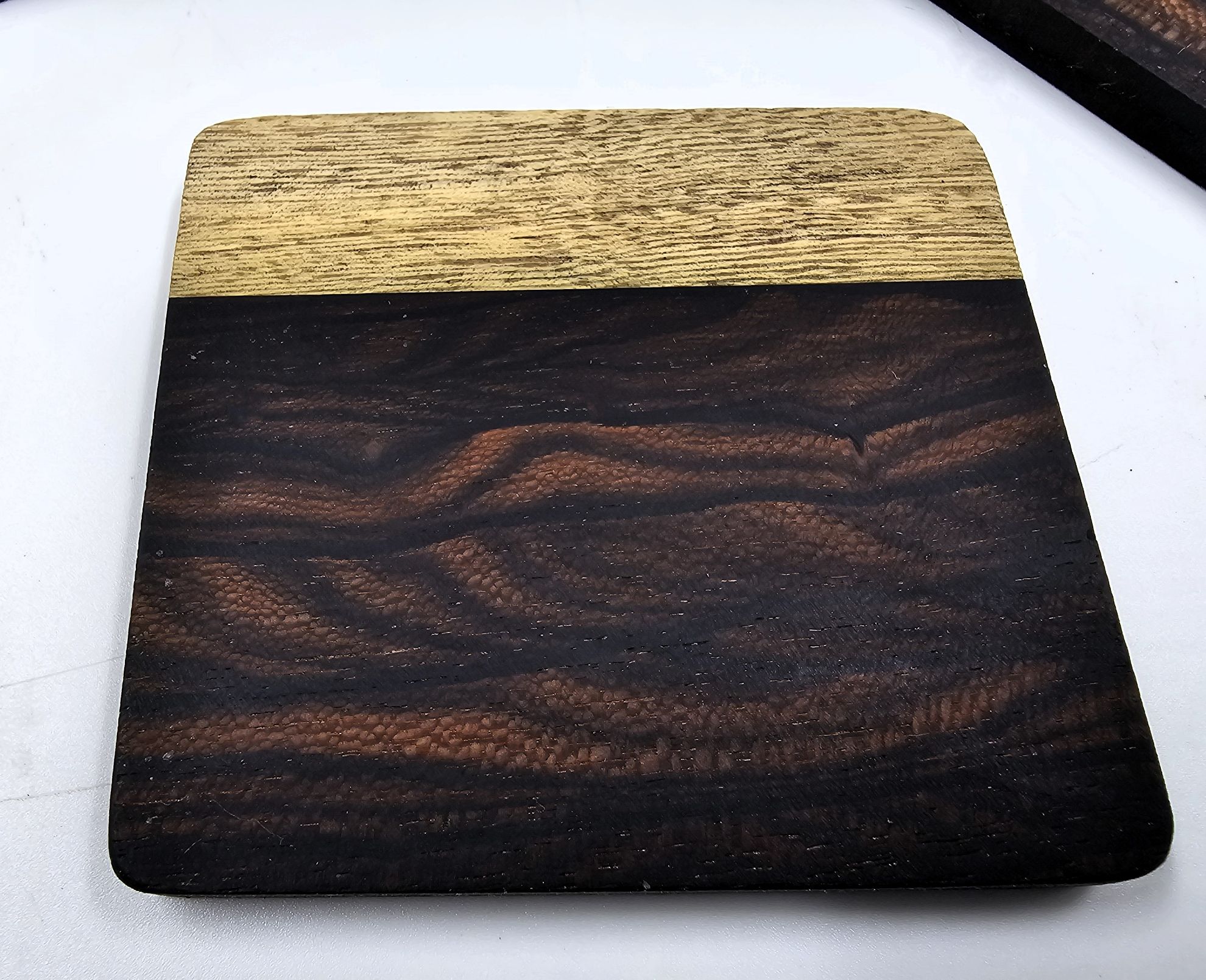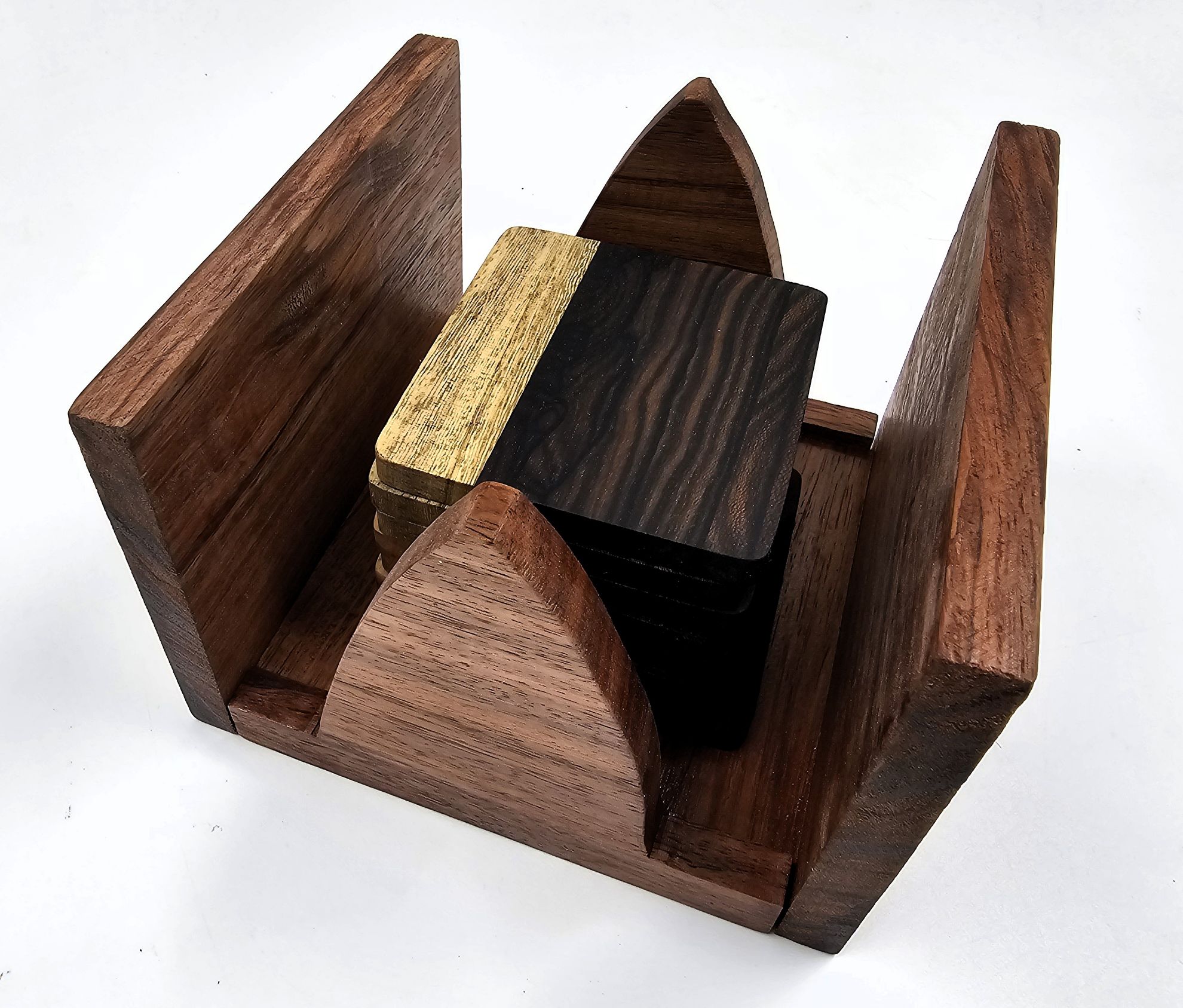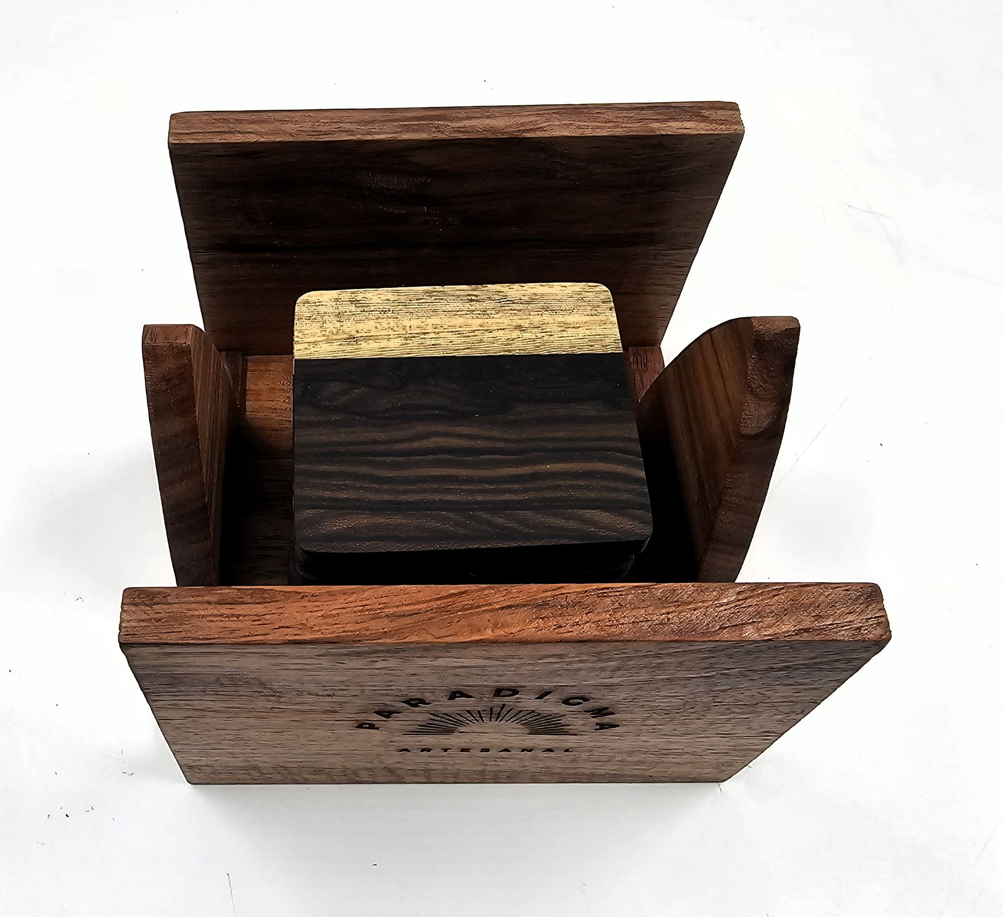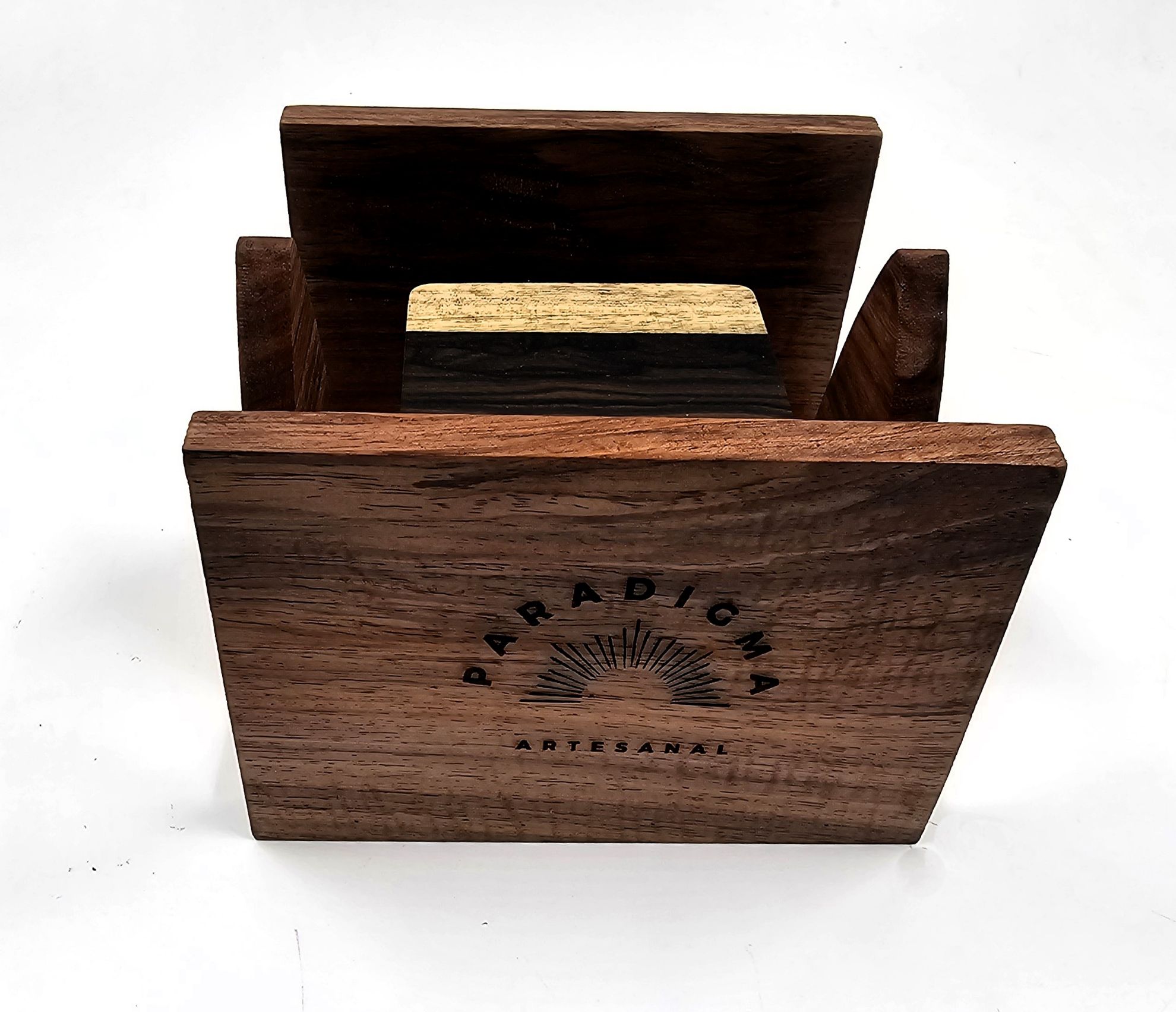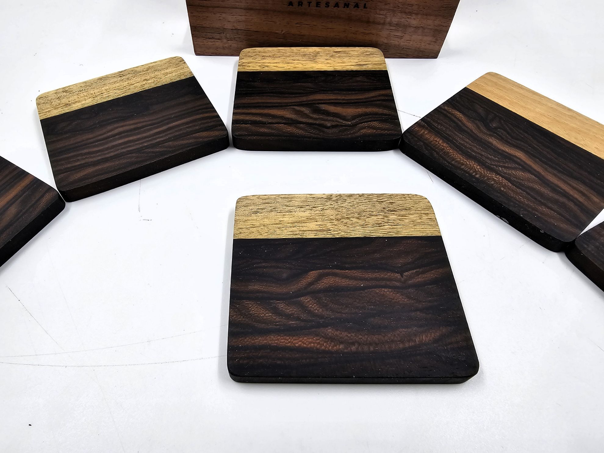 Juego de 8 Posavasos elaborado con Madera de Ziricote y Yaax Nik. Ambas son maderas Tropicas muy Exoticas. La dureza de estas maderas evita que la humedad, olor o color le penetren.