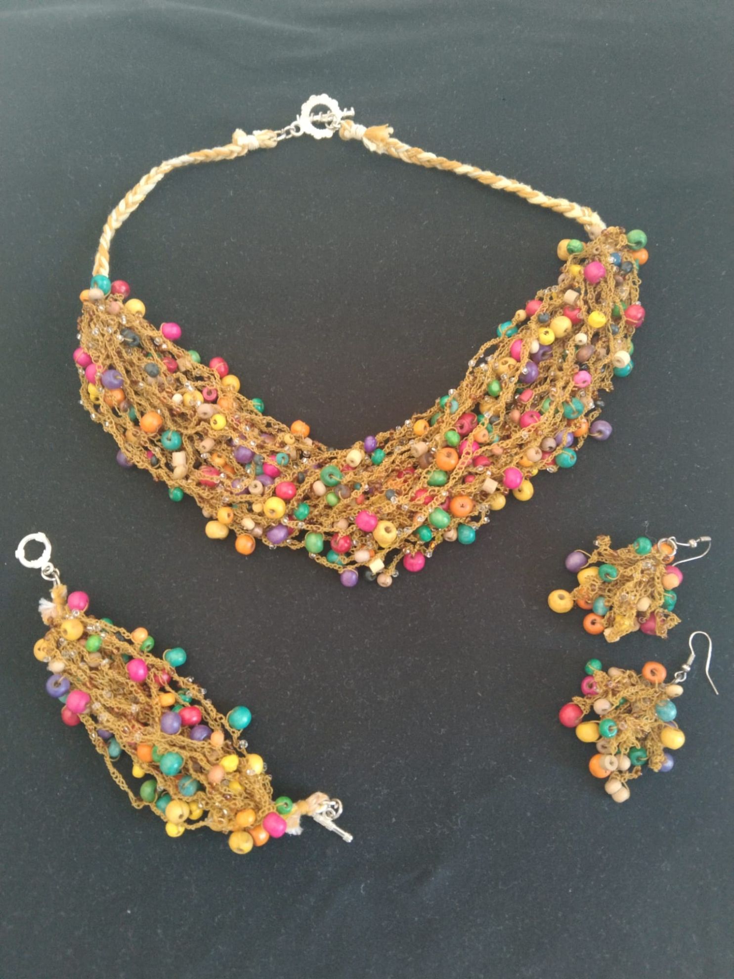 Accesorio de collar, pulsera y aretes, tejidos a mano con cuentas de madera de colores predominando color mostaza.