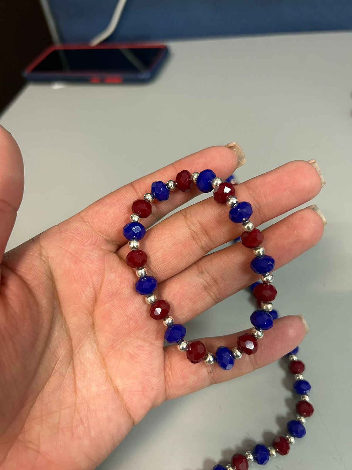 Hecho a mano con cristales de color azul y rojo