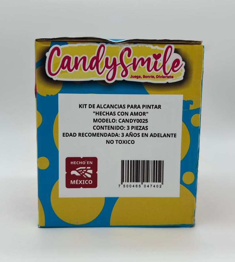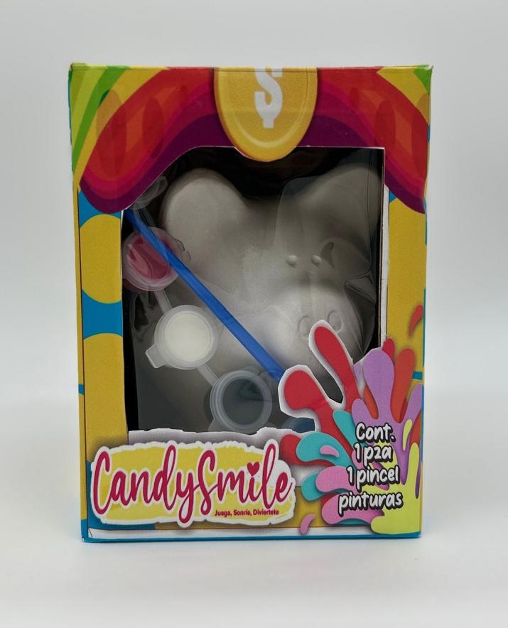 Caja de Alcancia para pintar- Candy Smile varias figuras. Cada Kit incluye: 1 alcancia de yeso lista para decorar 1 tira con 6 pinturas de colores vivos 1 pincel de alta calidad