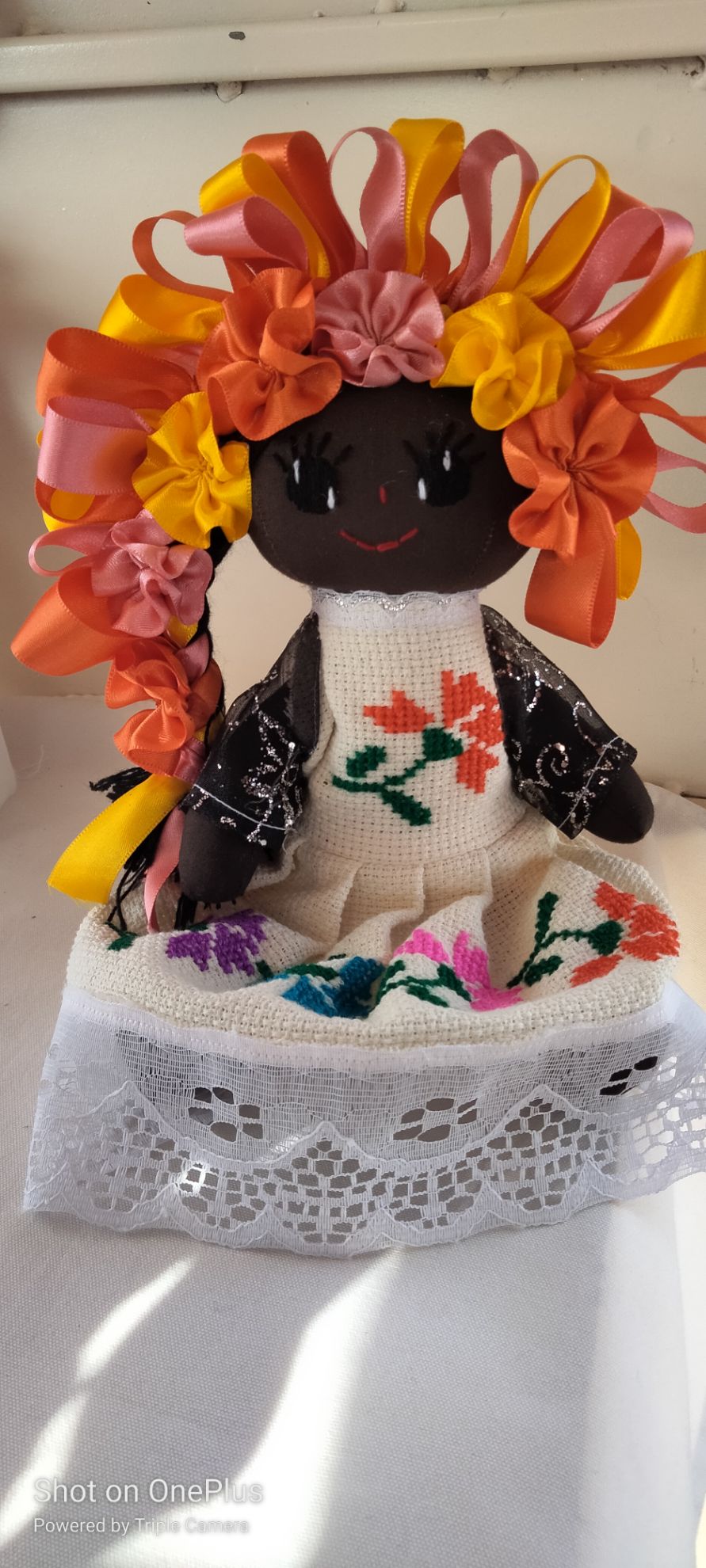 La muñeca lele esta echa a mano, lleva tela de popelina cafe obscuro relleno de algodón unidas con hilo homega falda de cuadrille bordado con estambre de colores en punto de cruz cabello de estambre con listones coloridos ojos bordados con estambre negro rojo y blanco.