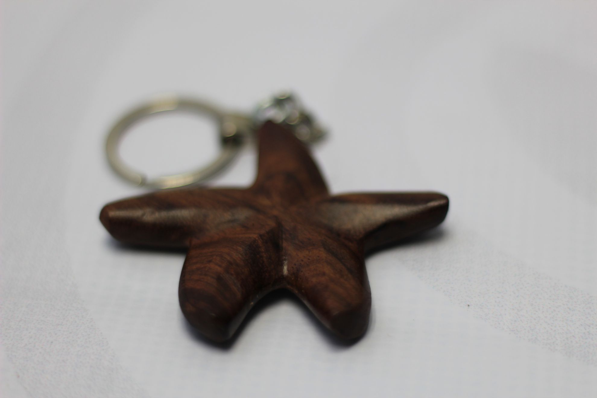 Llavero de estrella de mar de madera de Granadillo rescatada medidas: 6.5 x 6.5 x 2 cm.