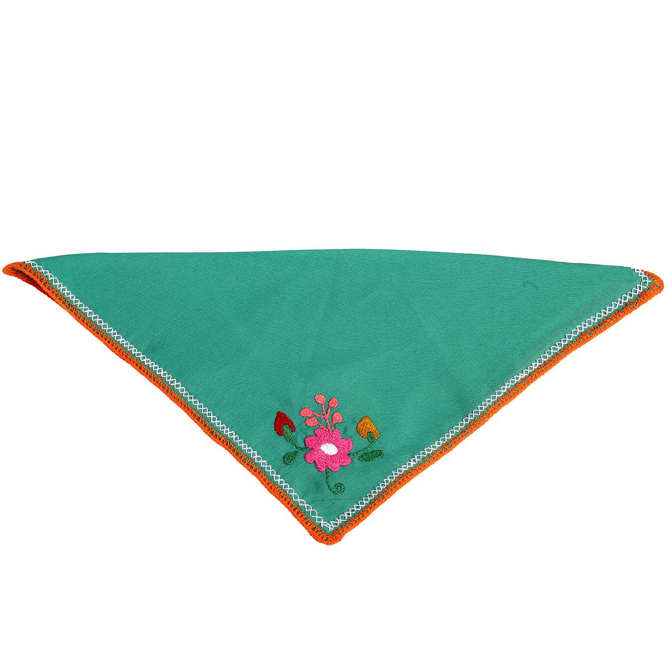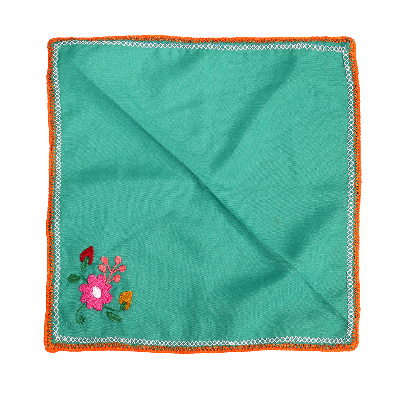 Luxu o pañuelo tradicional bordado a mano con hilos de algodón y orillas tejidas con aguja. Fue realizado por la artesana totonaca Lucía Simbrón.