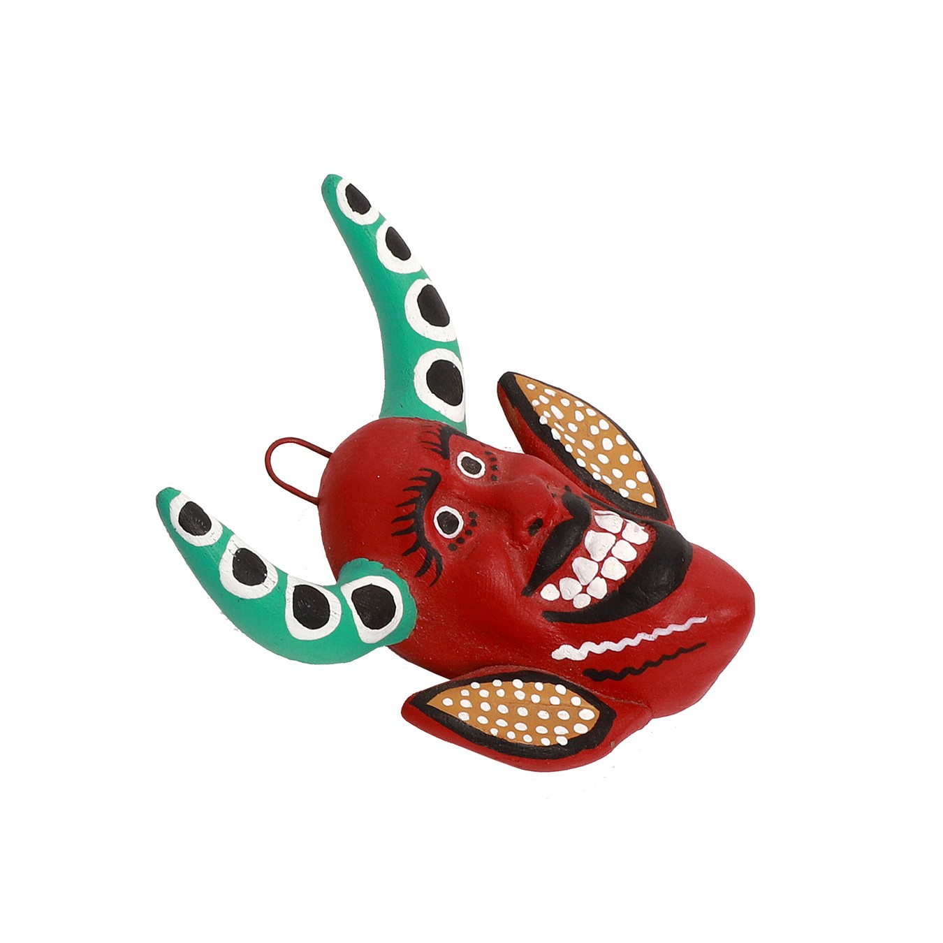 Máscara de diablo de barro modelado y policromado, esta pieza es única, surrealista y original, es un ejemplo característico de las piezas realizadas en Ocumicho, comunidad purépecha.