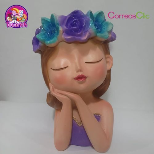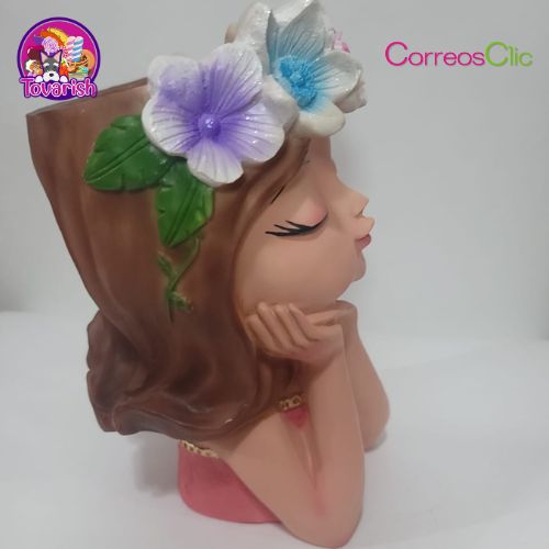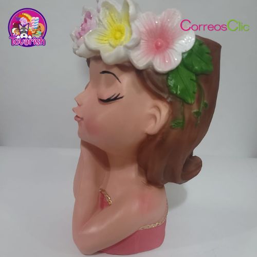 Hermosa maceta grande cara de Hada en posición de soñadora con corona de flores de colores, ideal para decorar tu espacio favorito.